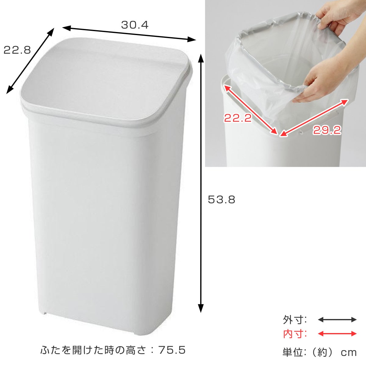 | サイズ | 約 幅30.4×奥行22.8×高さ53.8(cm) ふたを開けた時の高さ:約 75.5(cm) |
