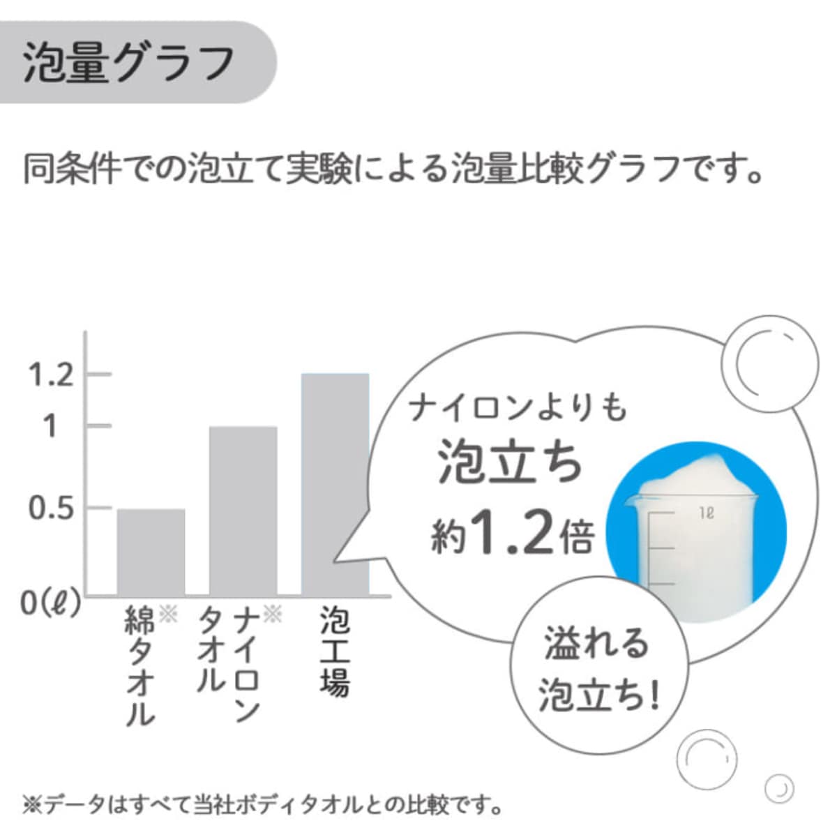 ●ナイロンタオルに比べ、1.2倍の泡立ちです。