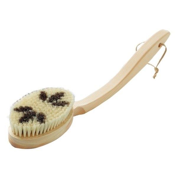 しっかりとカーブした柄部分は握りやすく、背中までラクに洗えます。素材は水に強いヒノキを使用しており、軽くて黒ずみにくいです。ブラシ部分も天然毛を使用しており安心してご利用頂けます。