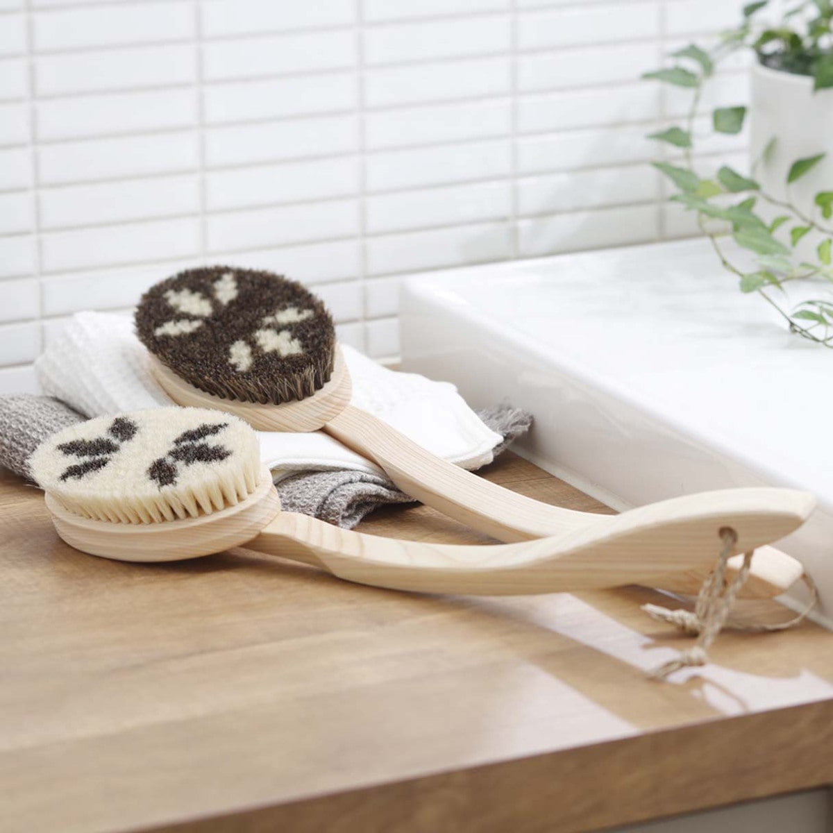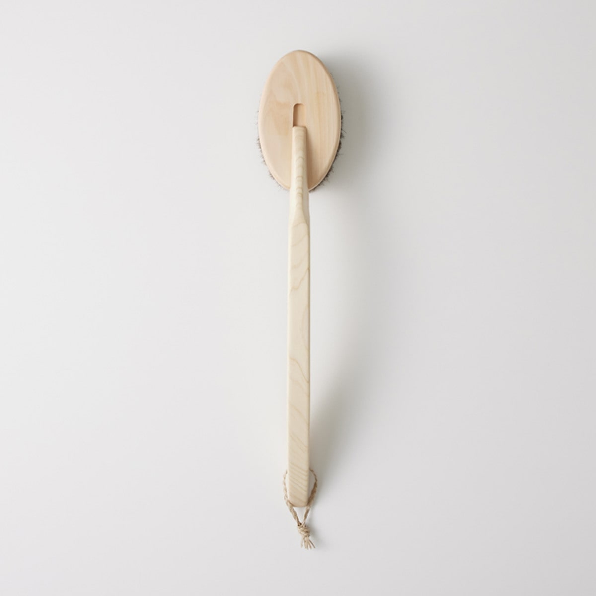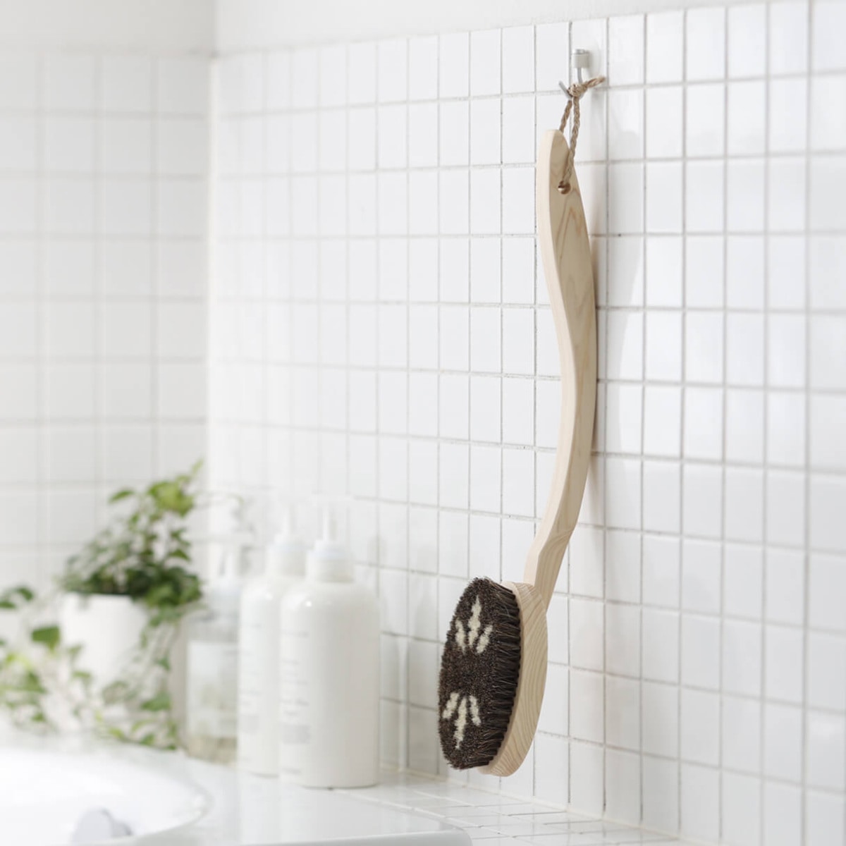 しっかりとカーブした柄部分は握りやすく、背中までラクに洗えます。素材は水に強いヒノキを使用しており、軽くて黒ずみにくいです。ブラシ部分も天然毛を使用しており安心してご利用頂けます。