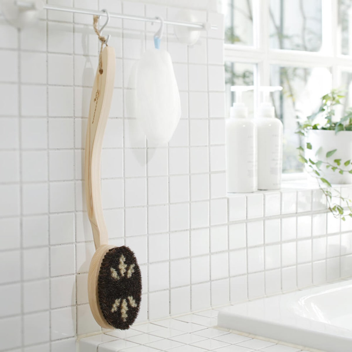 しっかりカーブの柄でラクに背中を洗えるボディブラシ