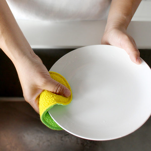 | ハード面 独自のハード樹脂加工で茶しぶなどのしつこい汚れをかき出し、水だけで汚れをスッキリ落とせます。 | ソフト面 ランダムに配置された柔らかいアクリルパイルで優しく洗えます。 |