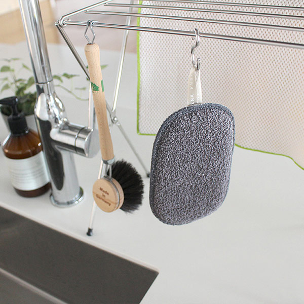 ●手の平サイズの薄型なので2つ折りにしやすく、お皿洗いもラクラクです。