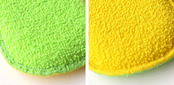 ●使い分けができる二面タイプで、イエローの面はやわらかいアクリルパイルです。アクリルタワシにありがちなキシキシ感がありません。