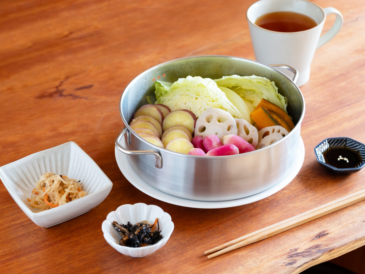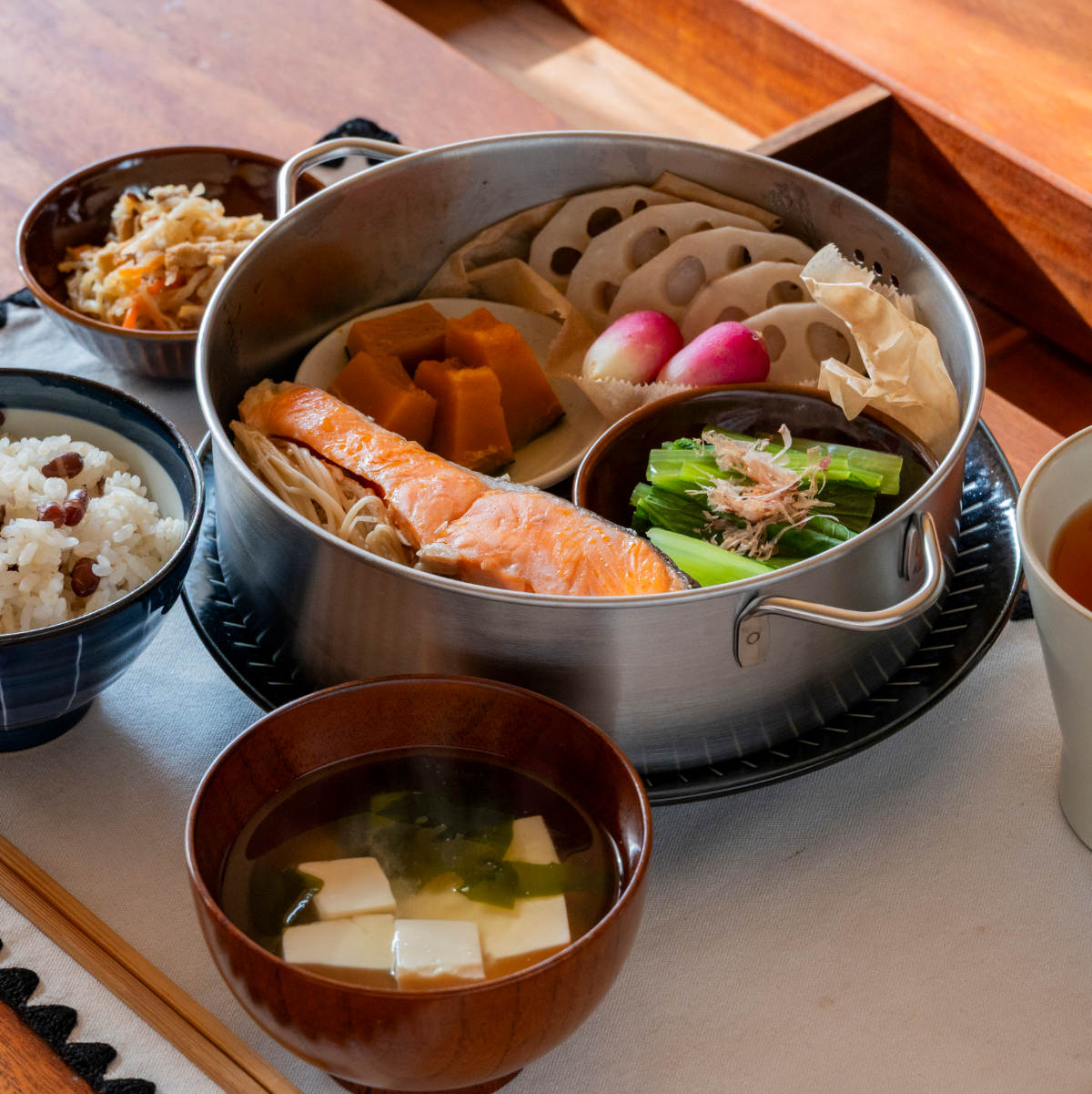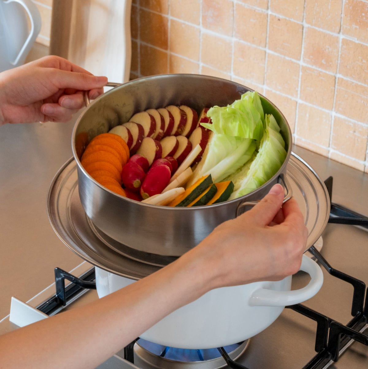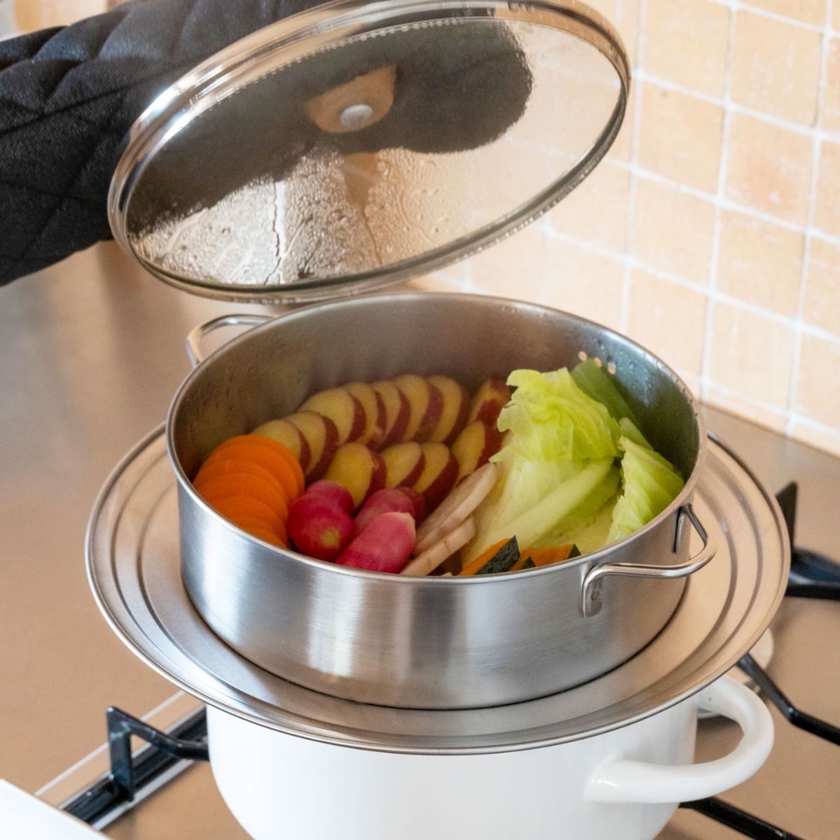 竹製せいろの風合いは魅力的ですが、「衛生面が心配」「お手入れが大変」「収納場所に困る」そんな声に応えて登場したのが、扱いやすいステンレス製せいろです。初めての方でも気軽に蒸し料理を楽しめます。