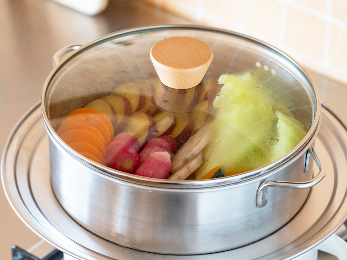 蓋を開けずに中の様子を確認できて蒸しすぎを防ぎます。ナチュラルな木製のつまみがアクセントになっています。