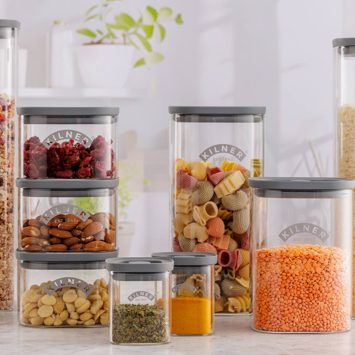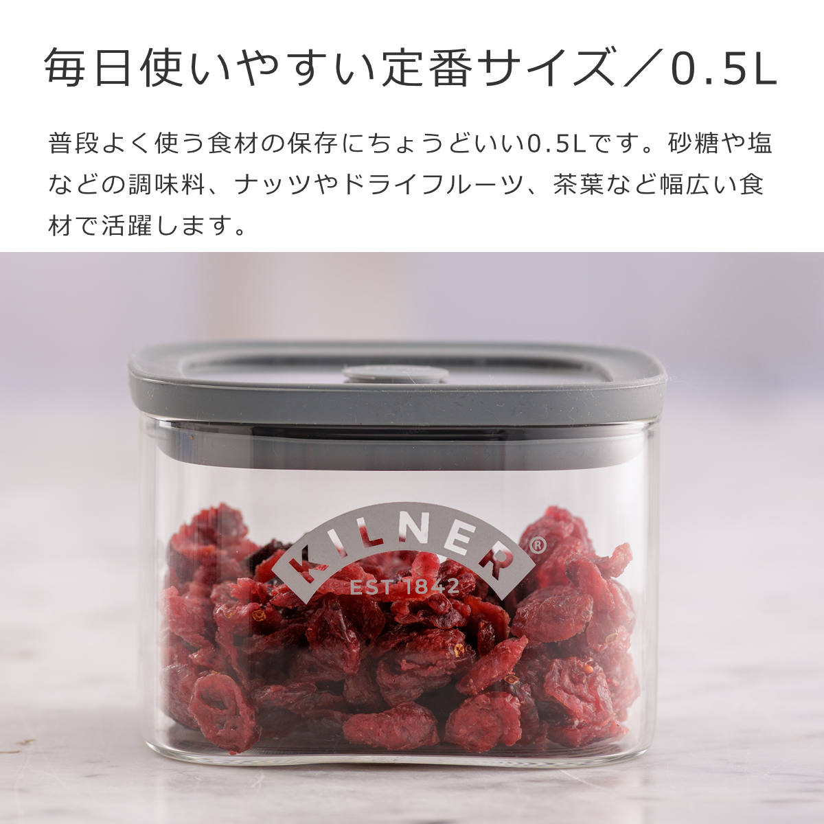 普段よく使う食材の保存にちょうどいい0.5Lサイズです。砂糖や塩などの調味料、ナッツやドライフルーツ、茶葉など幅広い食材で活躍します。