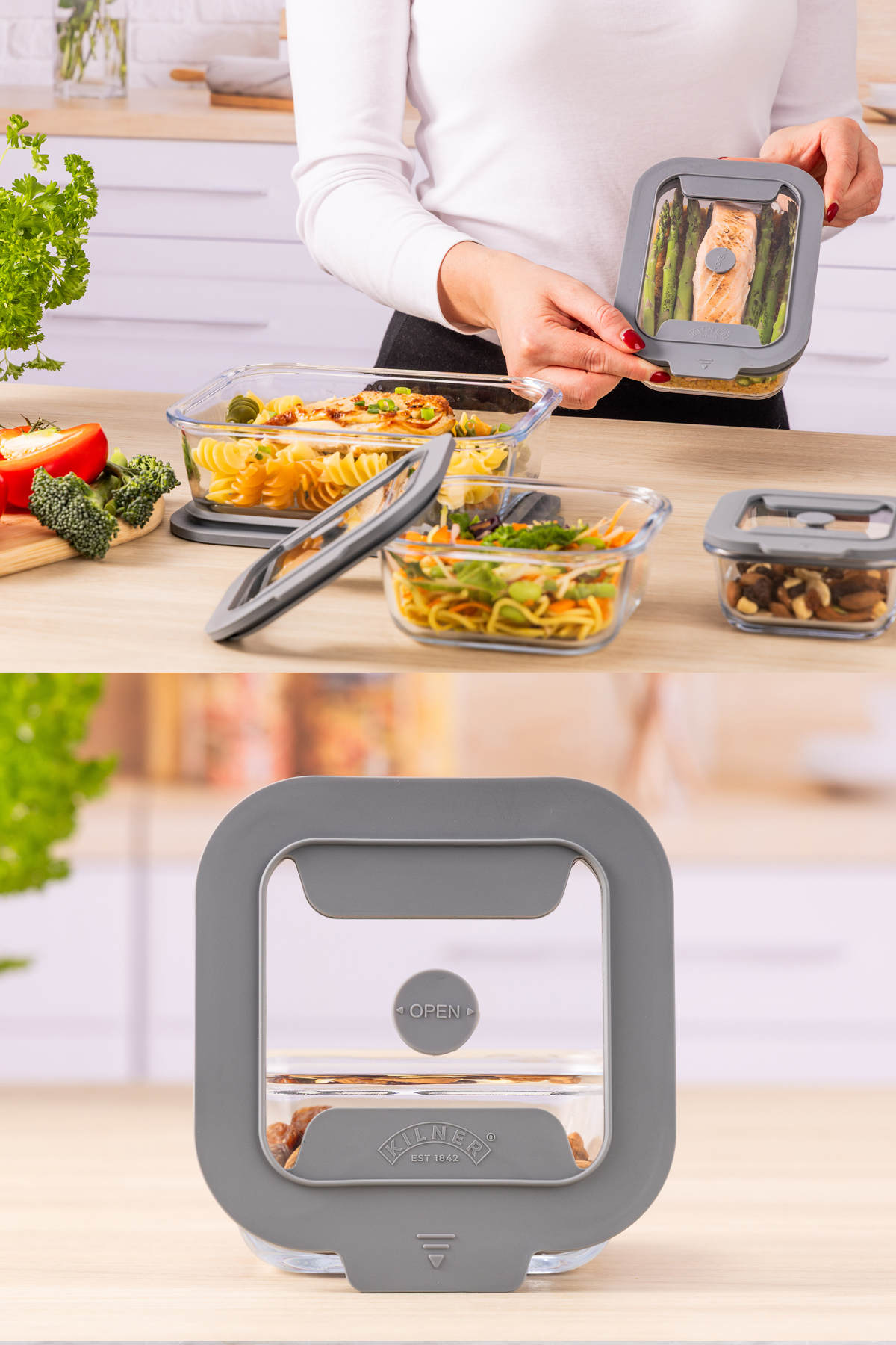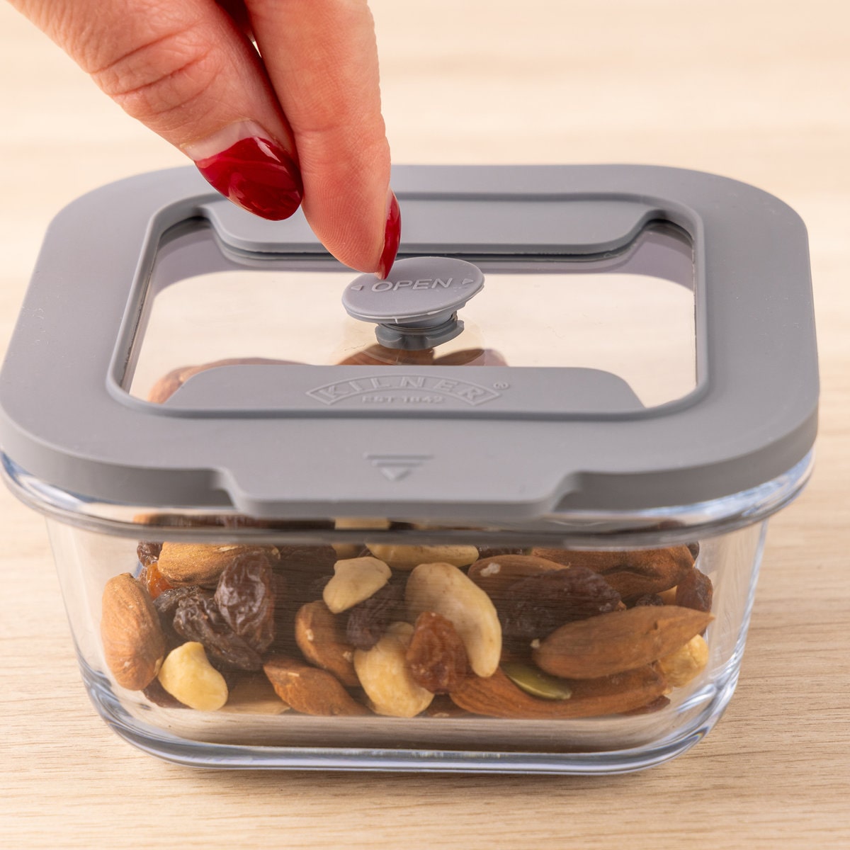 フタをのせる前に、バルブを上に引き上げてください。本体にフタをセットし、バルブを押し下げると密閉状態になります。フタを外す時は、バルブを上に引き上げて密閉状態を解除します。