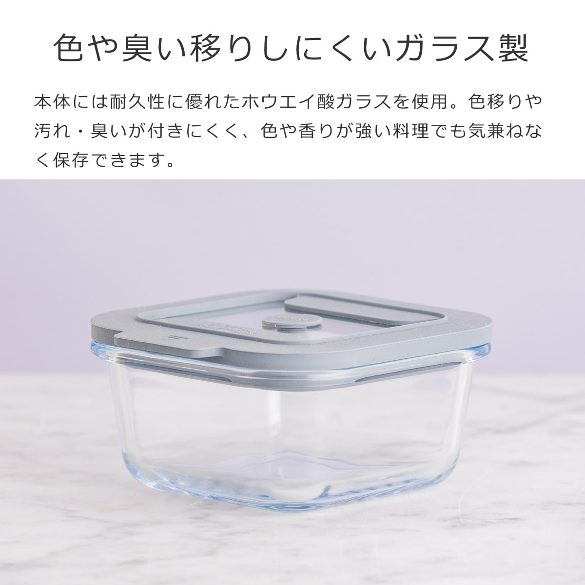 本体には耐久性に優れたホウエイ酸ガラスを使用。色移りや汚れ・臭いが付きにくく、色や香りが強い料理でも気兼ねなく保存できます。油汚れも簡単に落とせるので、長く衛生的に使えます。
