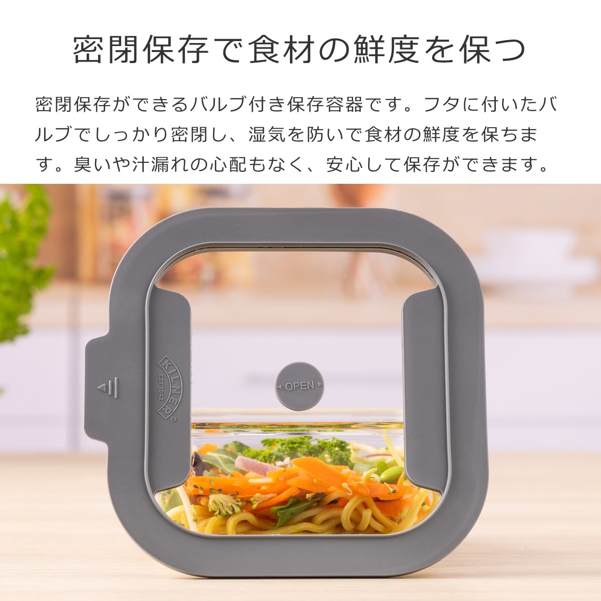 「NEW FRESH STORAGE」は、密閉保存ができるバルブ付き保存容器です。フタに付いたバルブの押し引きで簡単に密閉保存が可能です。高気密バルブでしっかり密閉し、湿気を防いで食材の鮮度を保ちます。臭いや汁漏れの心配もなく、安心して持ち運び・保存ができます。