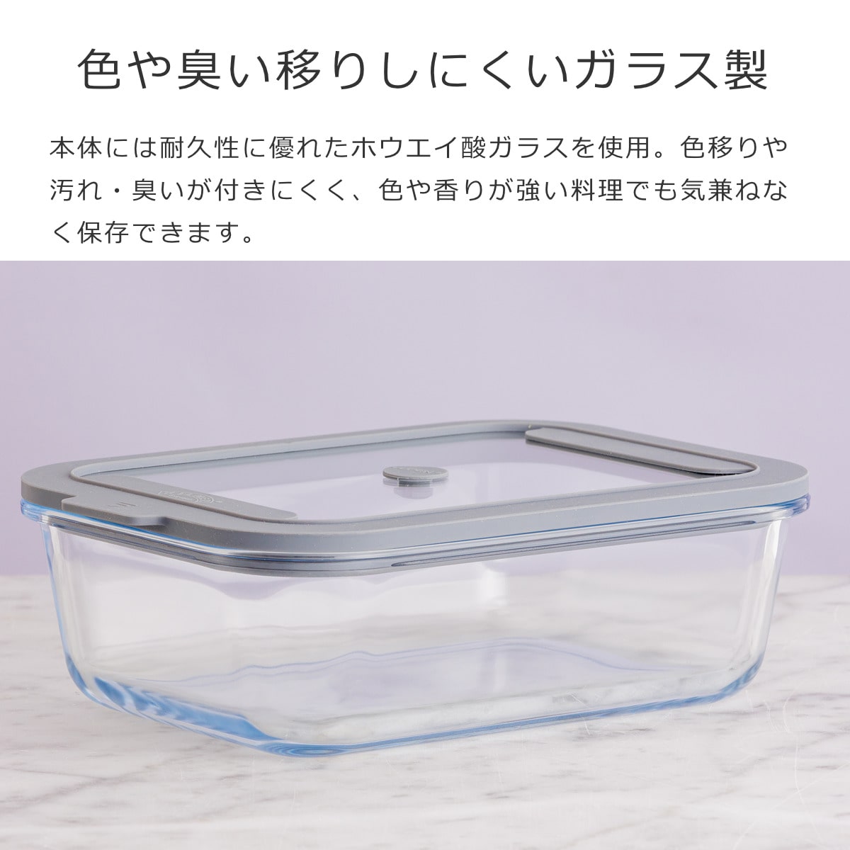 本体には耐久性に優れたホウエイ酸ガラスを使用。色移りや汚れ・臭いが付きにくく、色や香りが強い料理でも気兼ねなく保存できます。油汚れも簡単に落とせるので、長く衛生的に使えます。