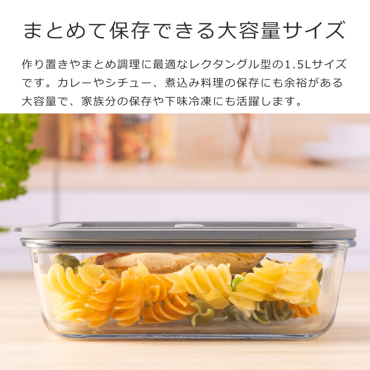 作り置きやまとめ調理に最適なレクタングル型の1.5Lサイズです。カレーやシチュー、煮込み料理の保存にも余裕がある大容量で、家族分の保存や下味冷凍にも活躍します。
