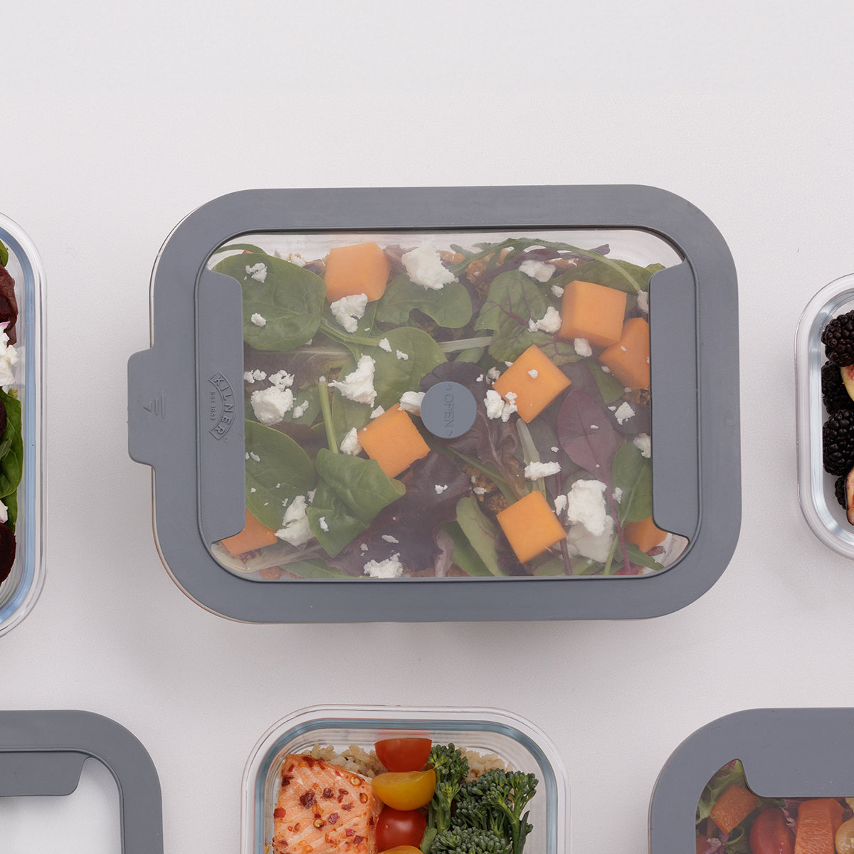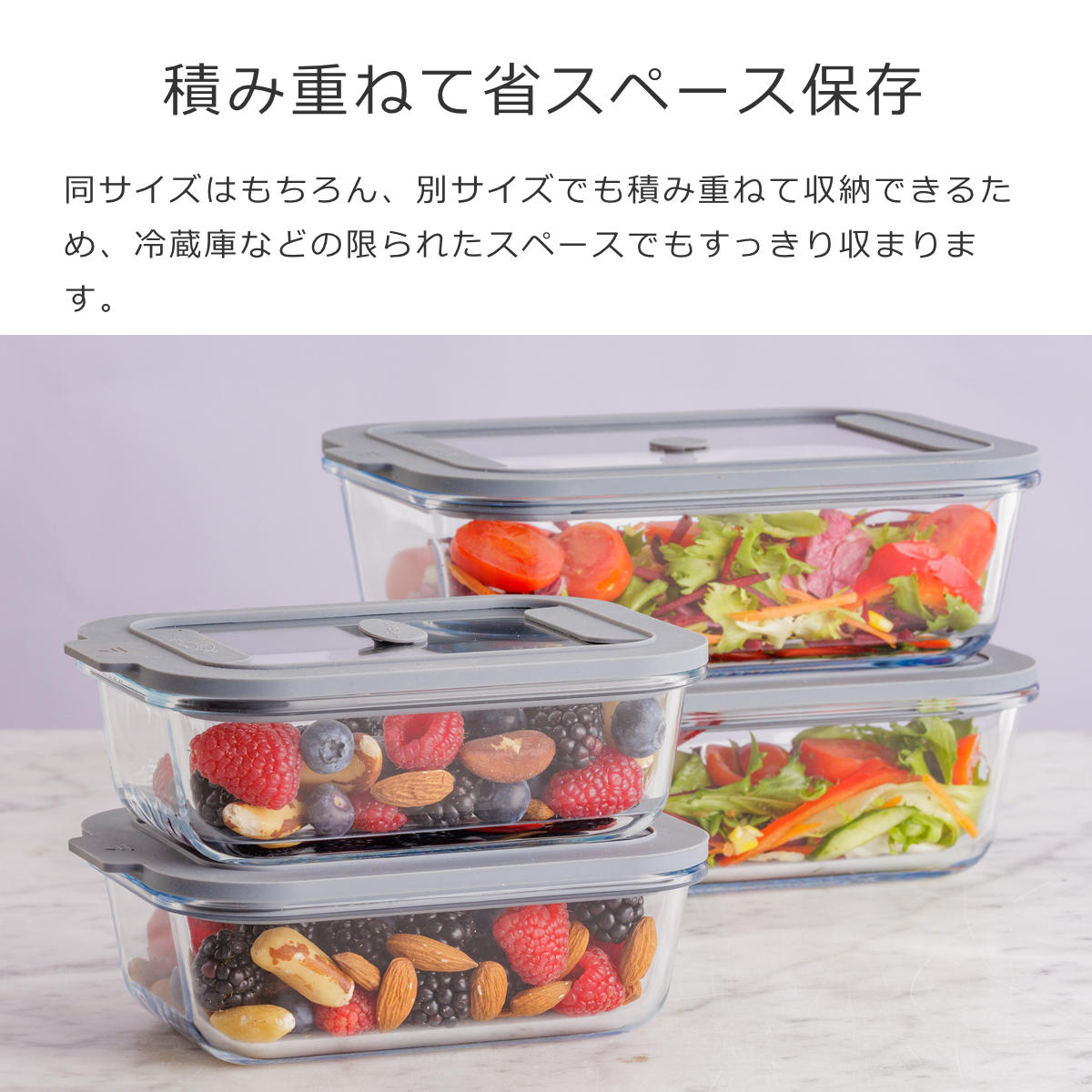同サイズはもちろん、別サイズでも積み重ねて収納ができるため、冷蔵庫などの限られたスペースでもすっきり収まります。