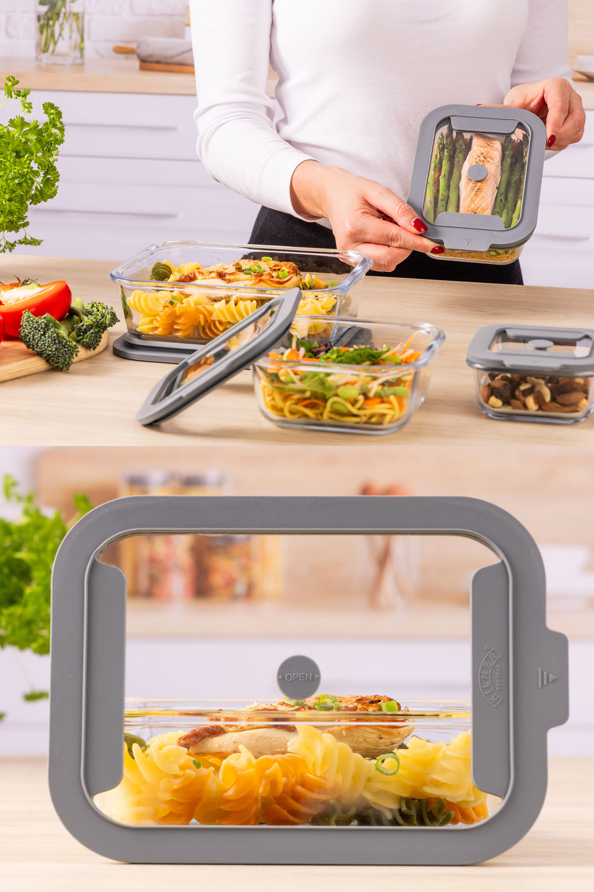 フタをのせる前に、バルブを上に引き上げてください。本体にフタをセットし、バルブを押し下げると密閉状態になります。フタを外す時は、バルブを上に引き上げて密閉状態を解除します。