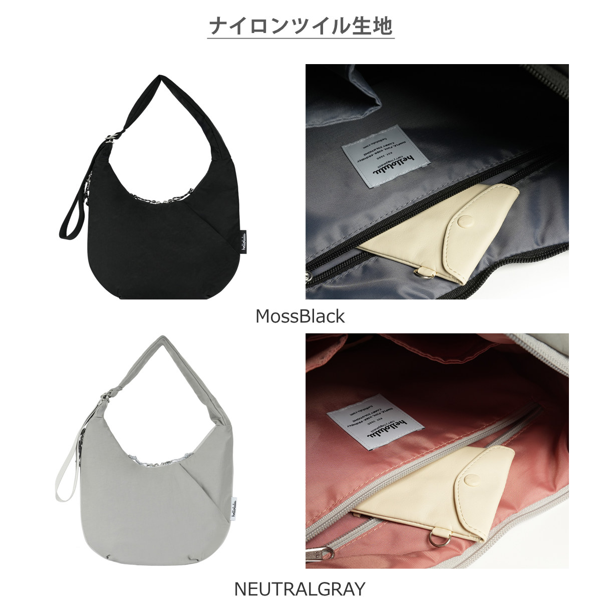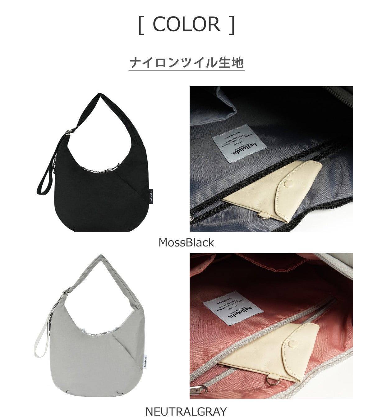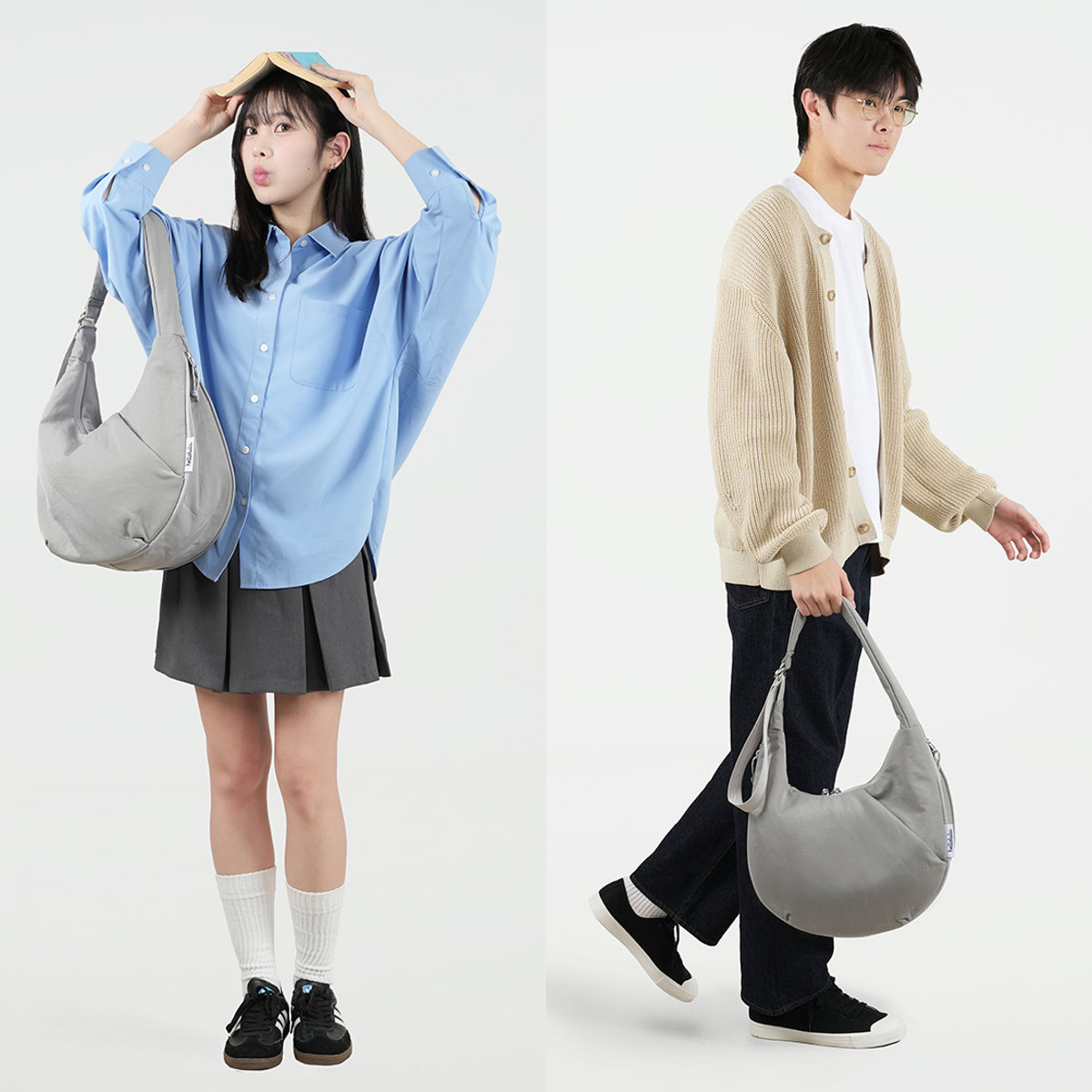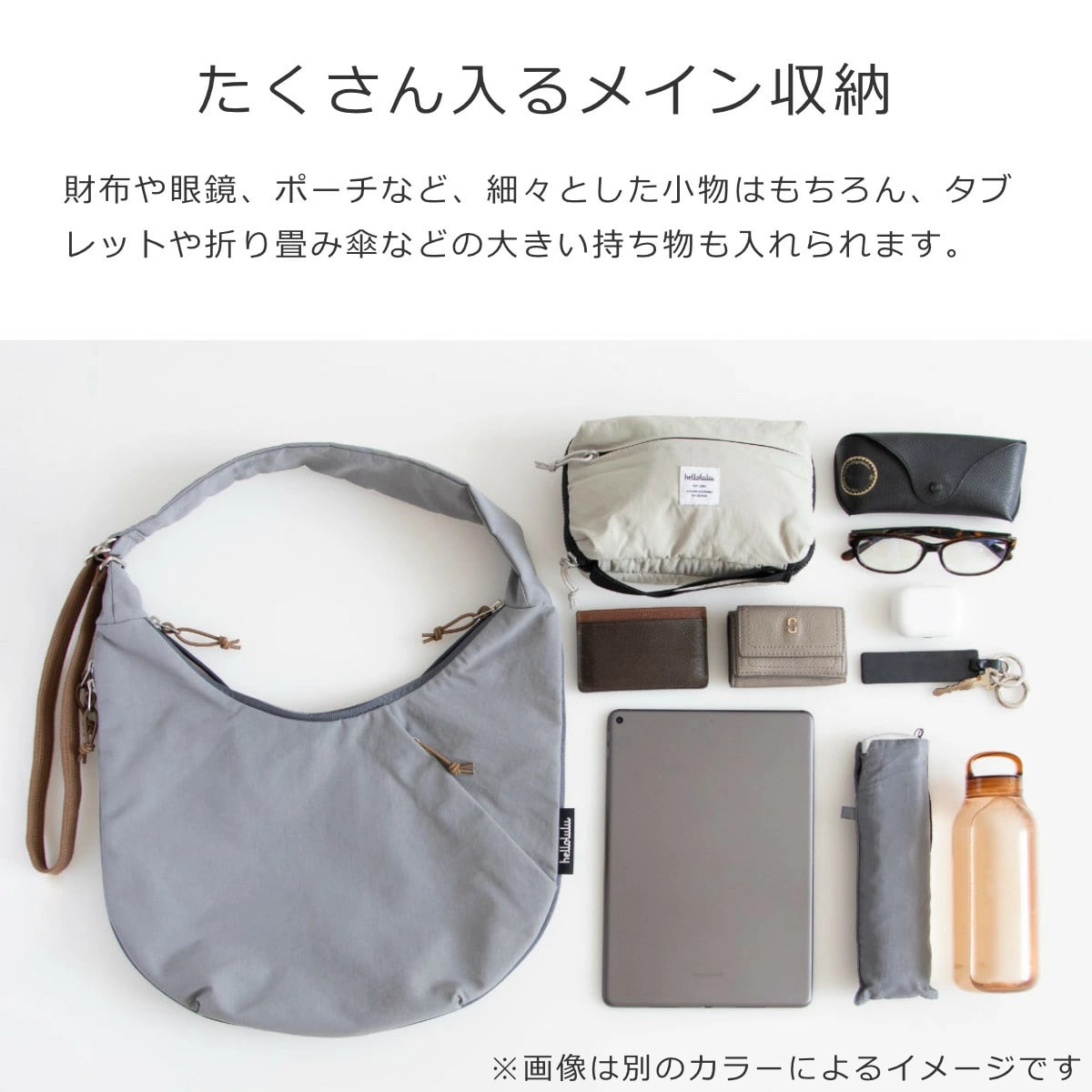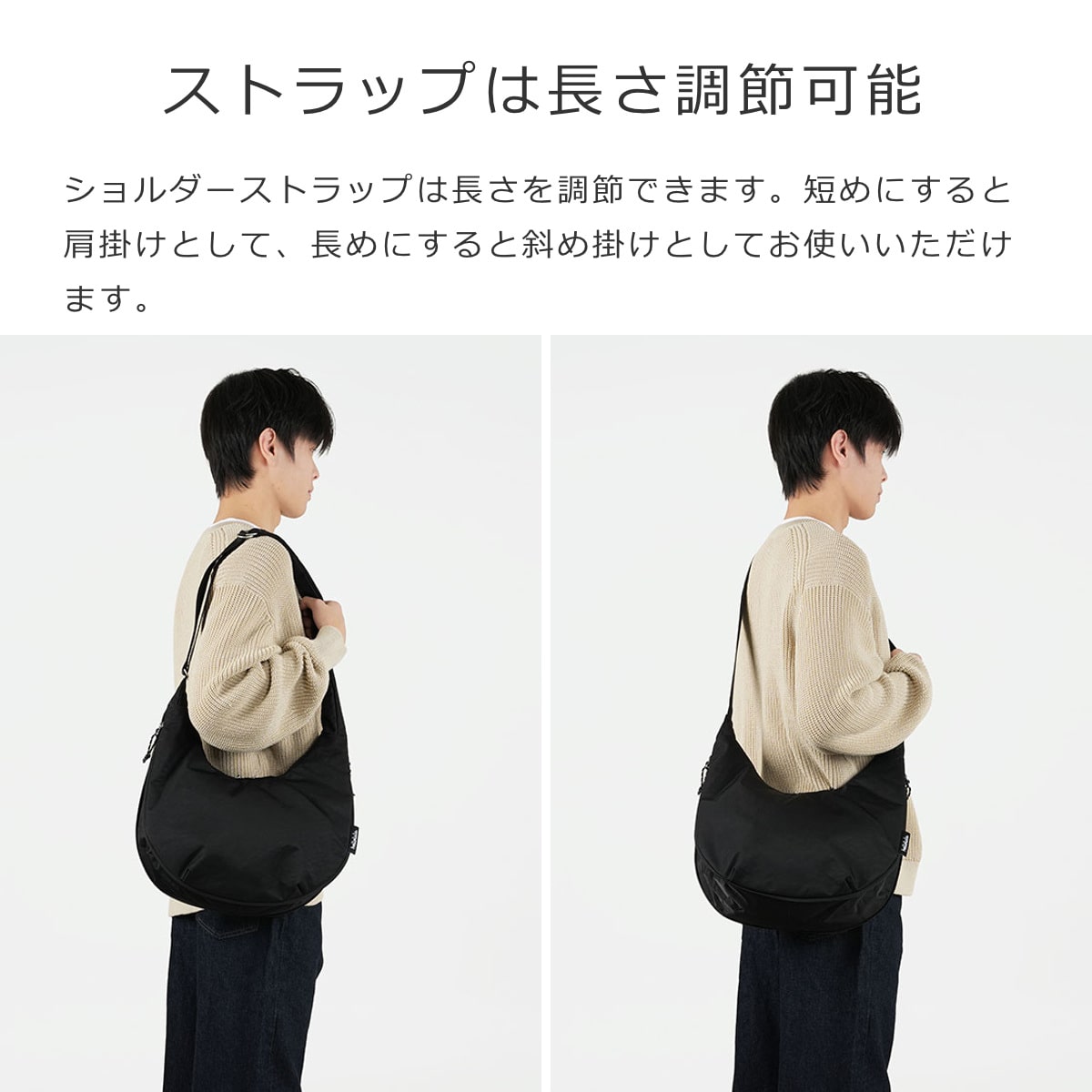 シーンに合わせて容量を変えられるハーフムーンバッグです。底部のファスナーを開くとマチができるので、荷物が増えてもこのバッグ1つで持ち運べます。