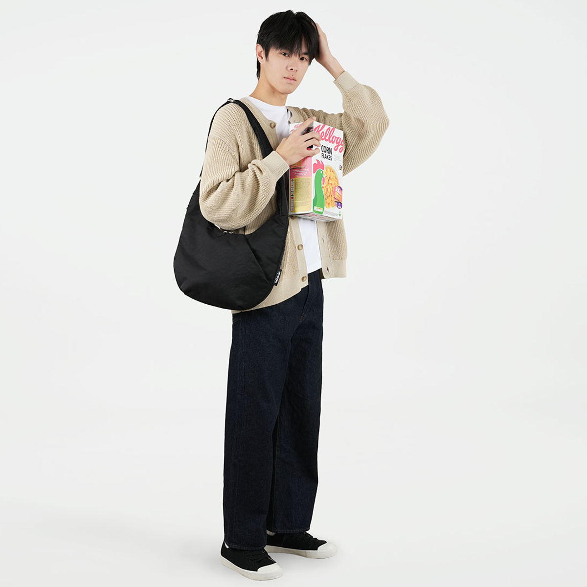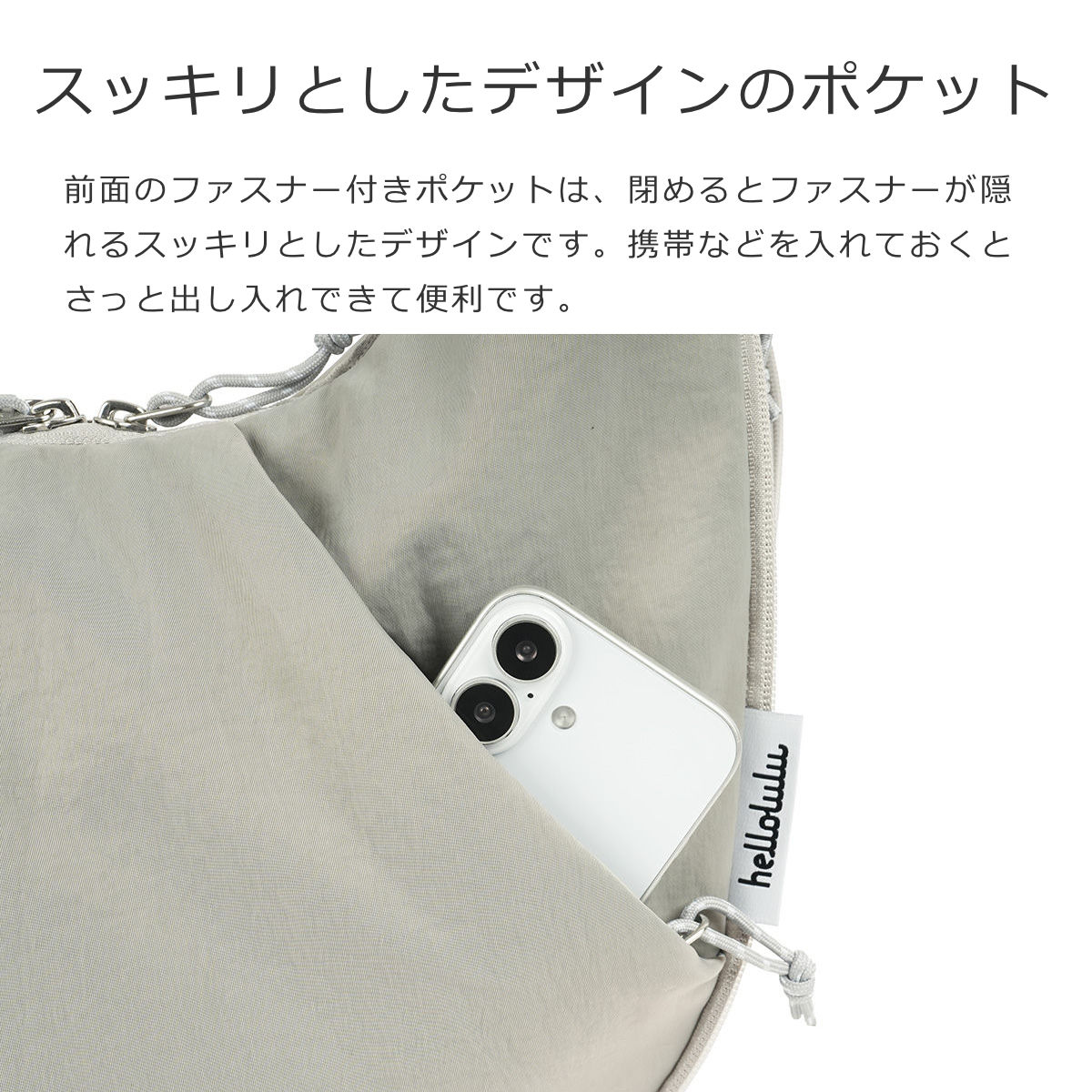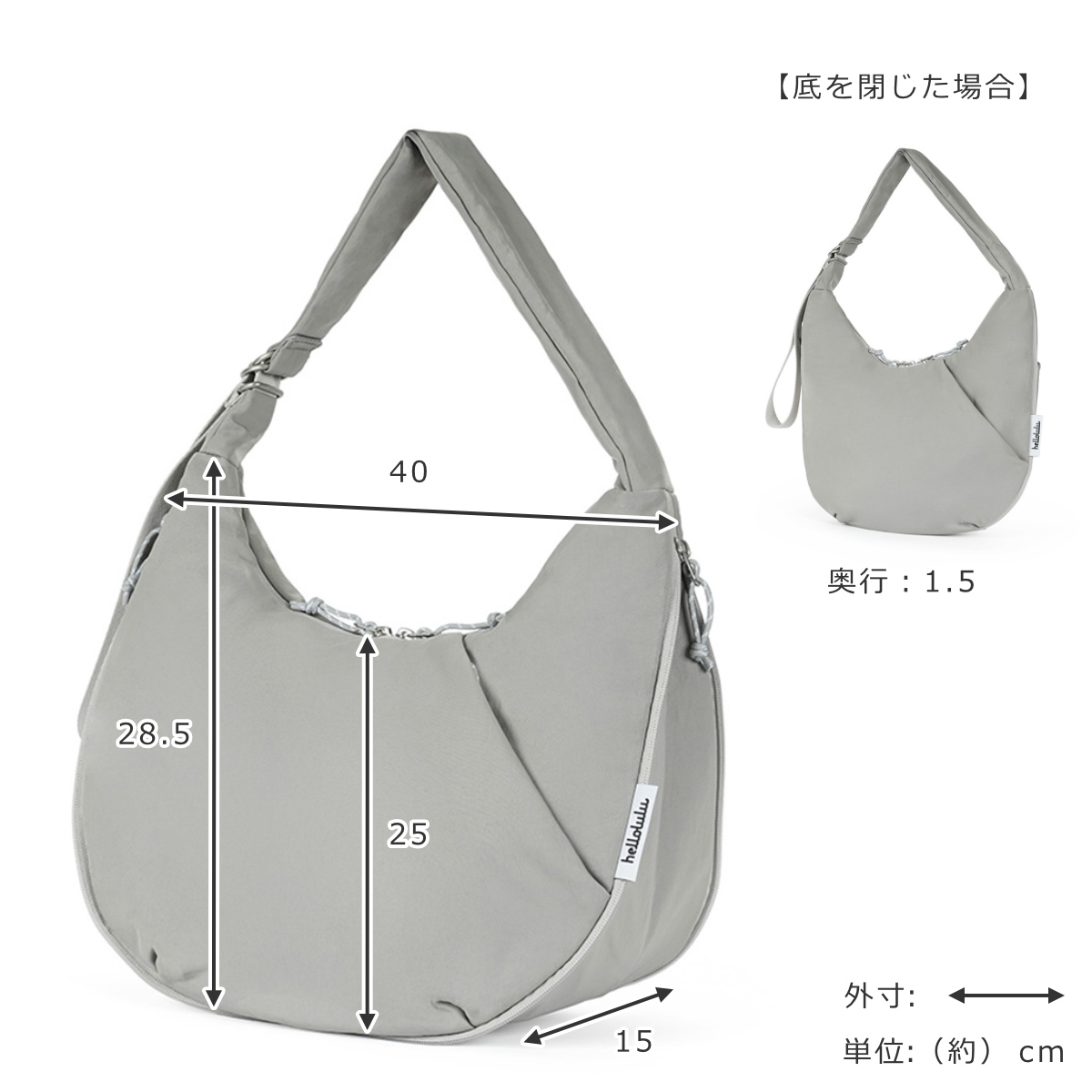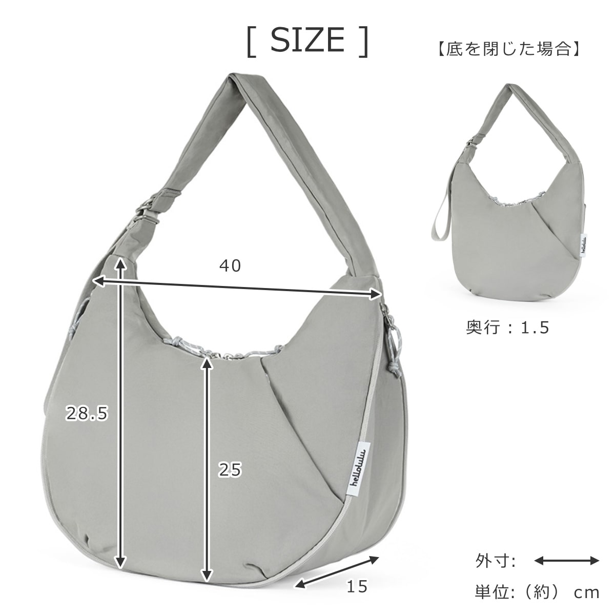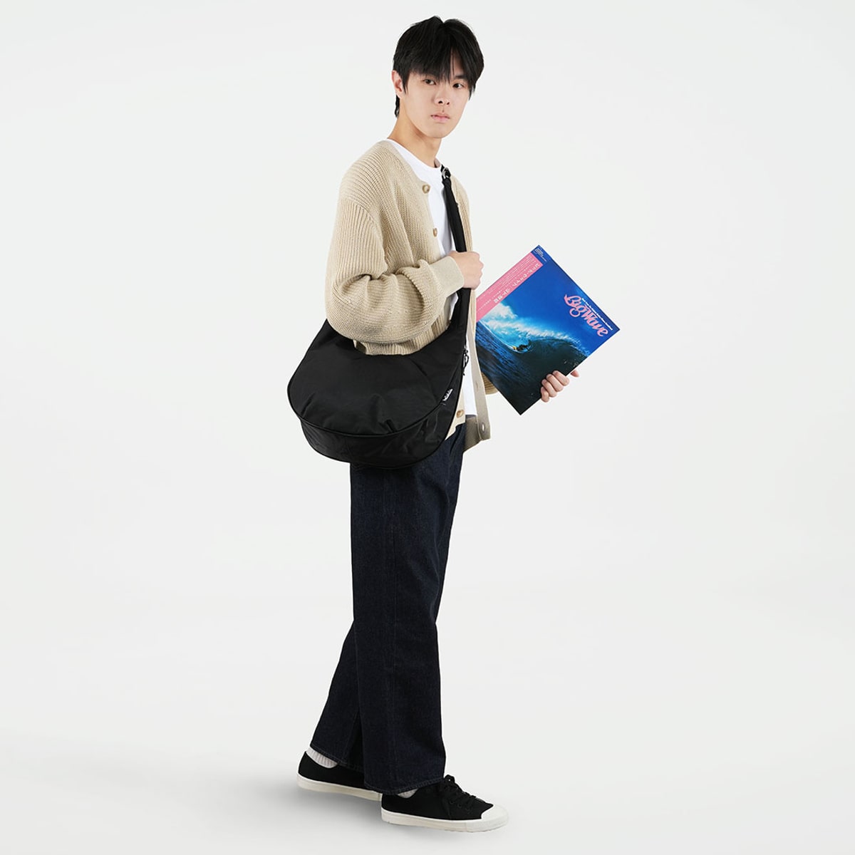 シーンに合わせて容量を変えられるハーフムーンバッグです。底部のファスナーを開くとマチができるので、荷物が増えてもこのバッグ1つで持ち運べます。