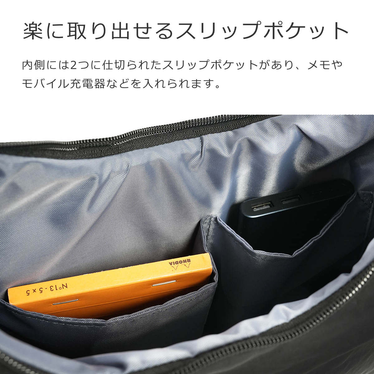 内側には2つに仕切られたスリップポケットがあり、メモやモバイル充電器などを入れられます。