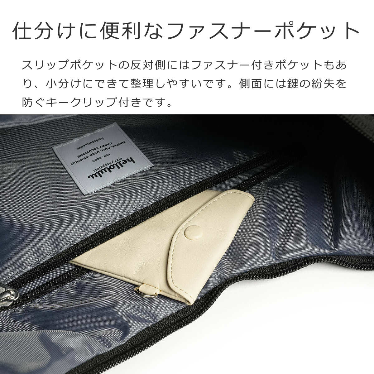 スリップポケットの反対側にはファスナー付きポケットもあり、小分けにできて整理しやすいです。側面には鍵の紛失を防ぐキークリップ付きです。