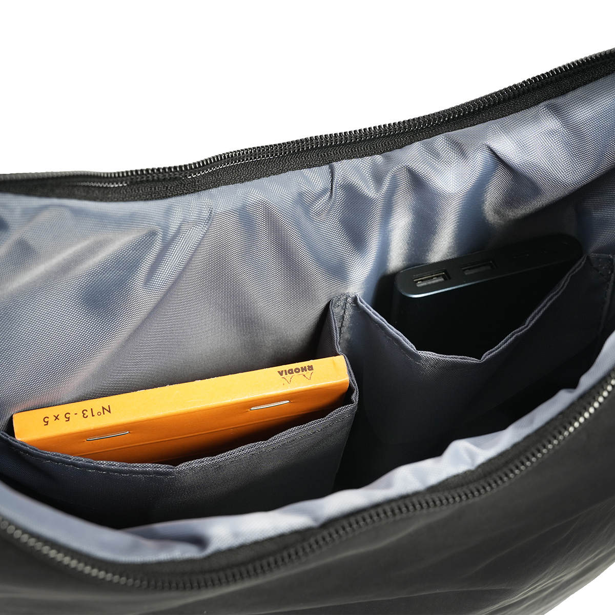 メイン収納はダブルファスナー仕様です。財布や眼鏡、ポーチなど、細々とした小物はもちろん、タブレットや折り畳み傘などの大きい持ち物も入れられます。