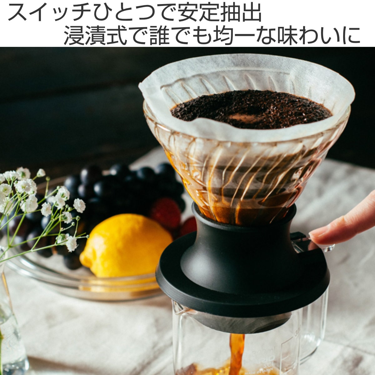 ハリオ独自の浸漬式スイッチ構造により、誰でも簡単にベストな抽出タイミングを作り出せる浸漬式ドリッパーです。お湯を注いで、あとは待つだけのシンプル操作で、安定した美味しさを楽しめます。出来上がり量約200mlは、マグカップ1杯分に最適なサイズです。