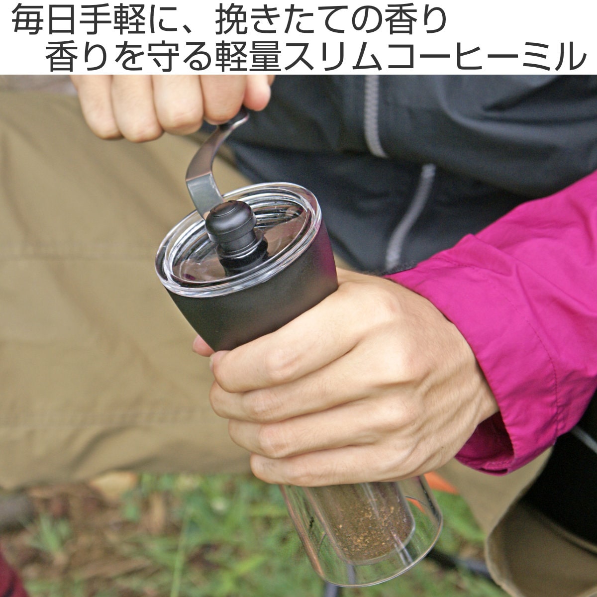 軽量でコンパクトな設計のため、アウトドアや旅行にも気軽に持ち運べます。自宅はもちろん、キャンプや外出先でも挽きたてのコーヒーを楽しめます。