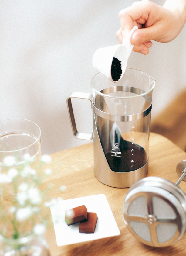 コーヒーの場合はコーヒー粉全体が湿る程度のお湯をかけて1分蒸らし、その後残りのお湯を静かに注ぎ、フタをセットして2分程度コーヒー粉の対流が収まるまで待ちます。