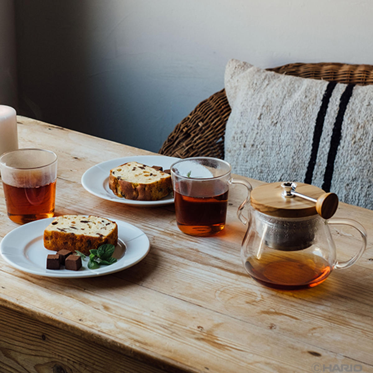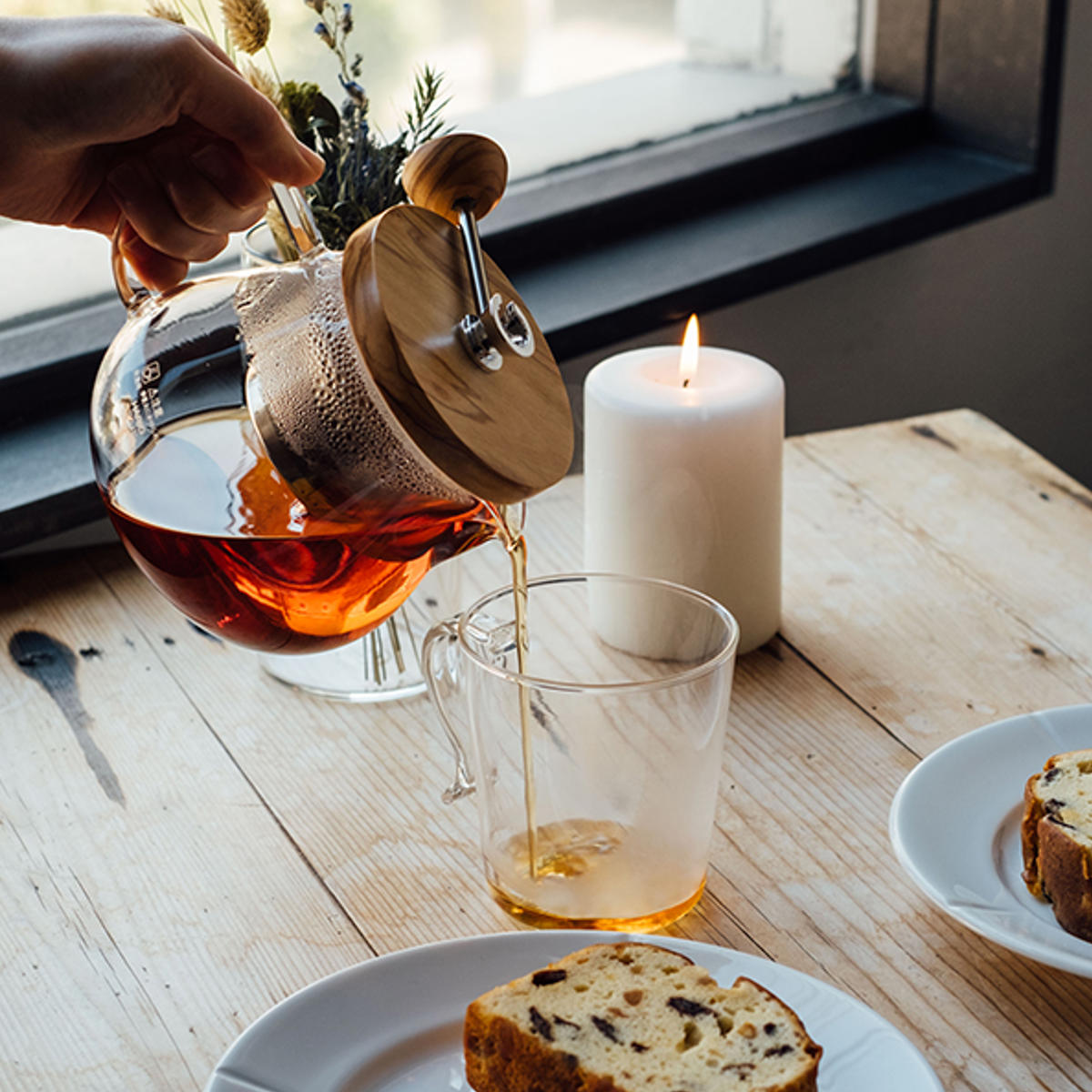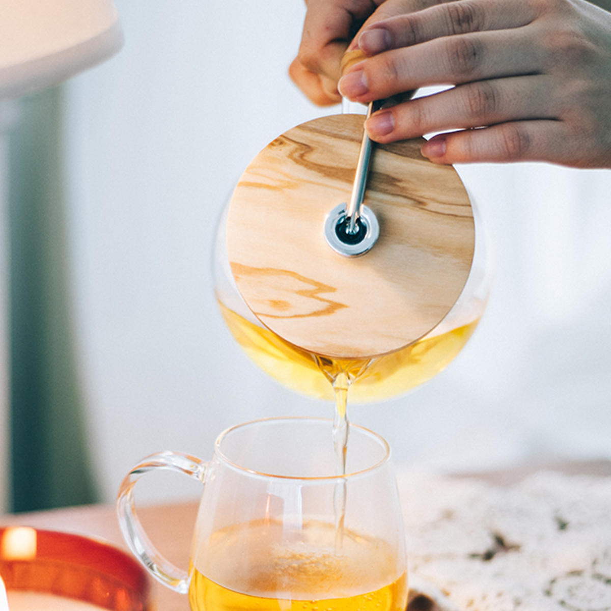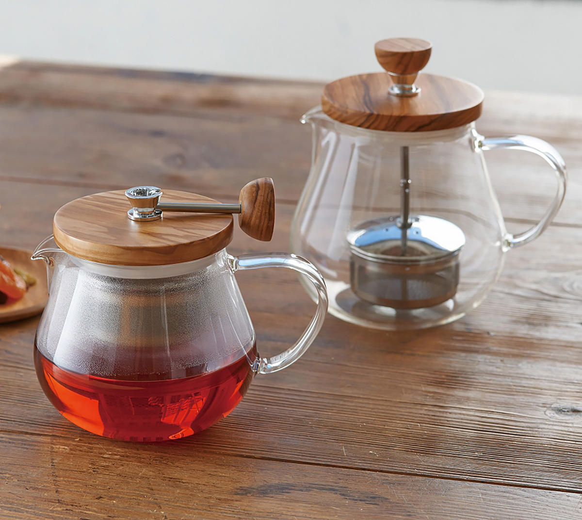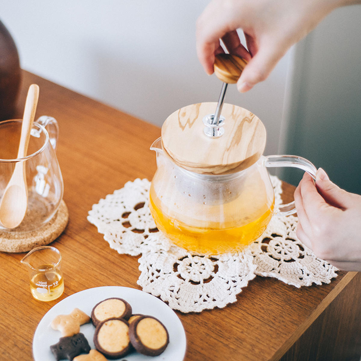 オリーブウッドのぬくもりとガラスの透明感が調和したティーポットです。本体は耐熱ガラス製で、熱湯も安心。自然な木の風合いがテーブルにやさしく馴染み、和洋どちらの食卓にもすっと溶け込みます。来客時に便利な700mlサイズです。