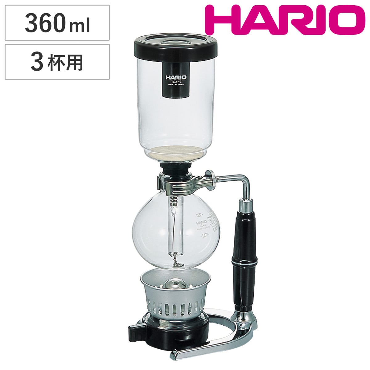 業務用のガスバーナーにもアルコールランプにも対応した、ハリオのコーヒーサイフォンです。真空と気圧差を利用するサイフォン方式により、雑味を抑えながら豆本来の風味を引き出し、家庭でもプロのような抽出が楽しめます。実用容量は約360mlで3杯分のコーヒーを淹れられます。