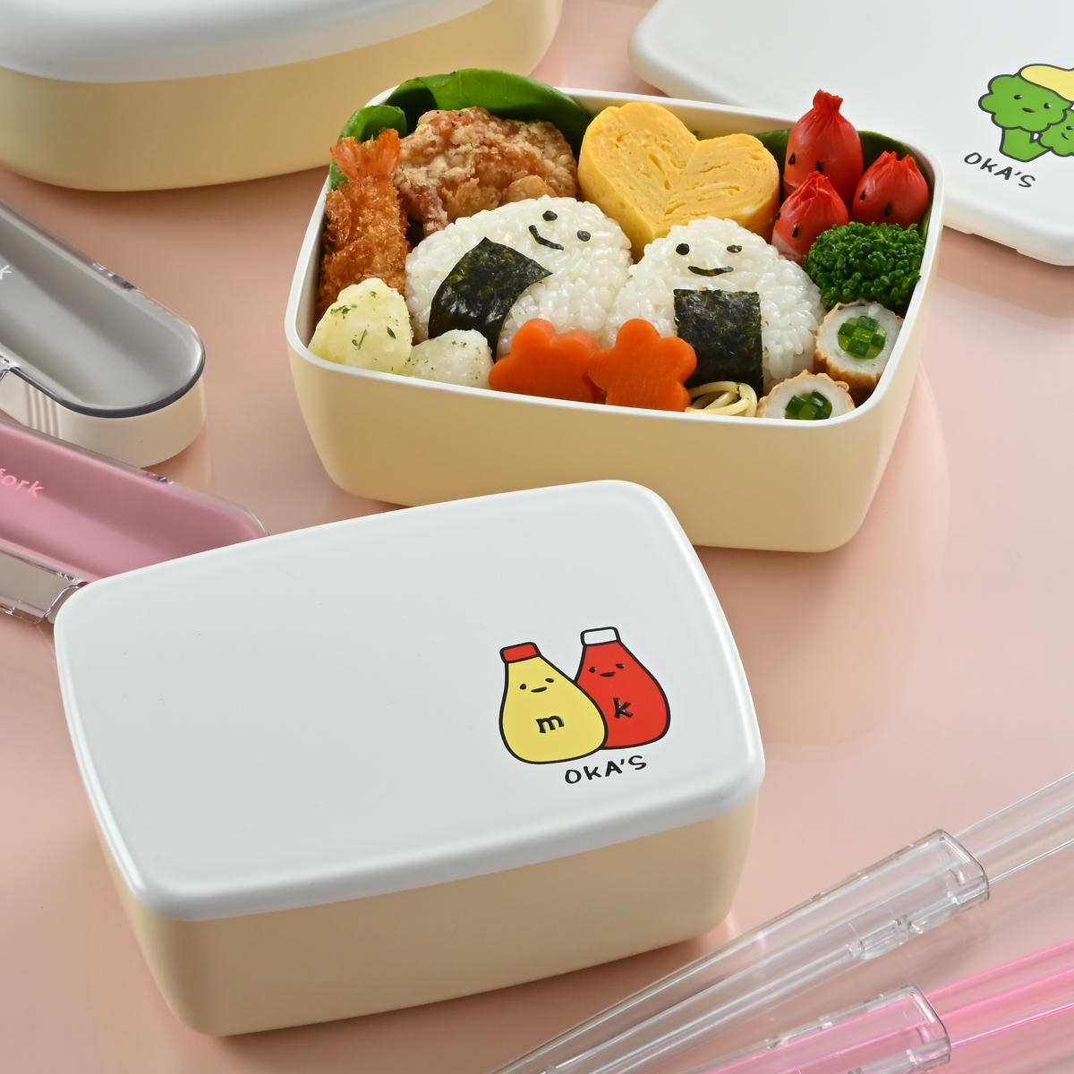 「OKA'S」シリーズは、ゆるっと可愛いおかず柄のイラストがユニークなデザイン。楽しいおかずたちに思わずにっこり!ランチタイムをあたたかく彩ります。