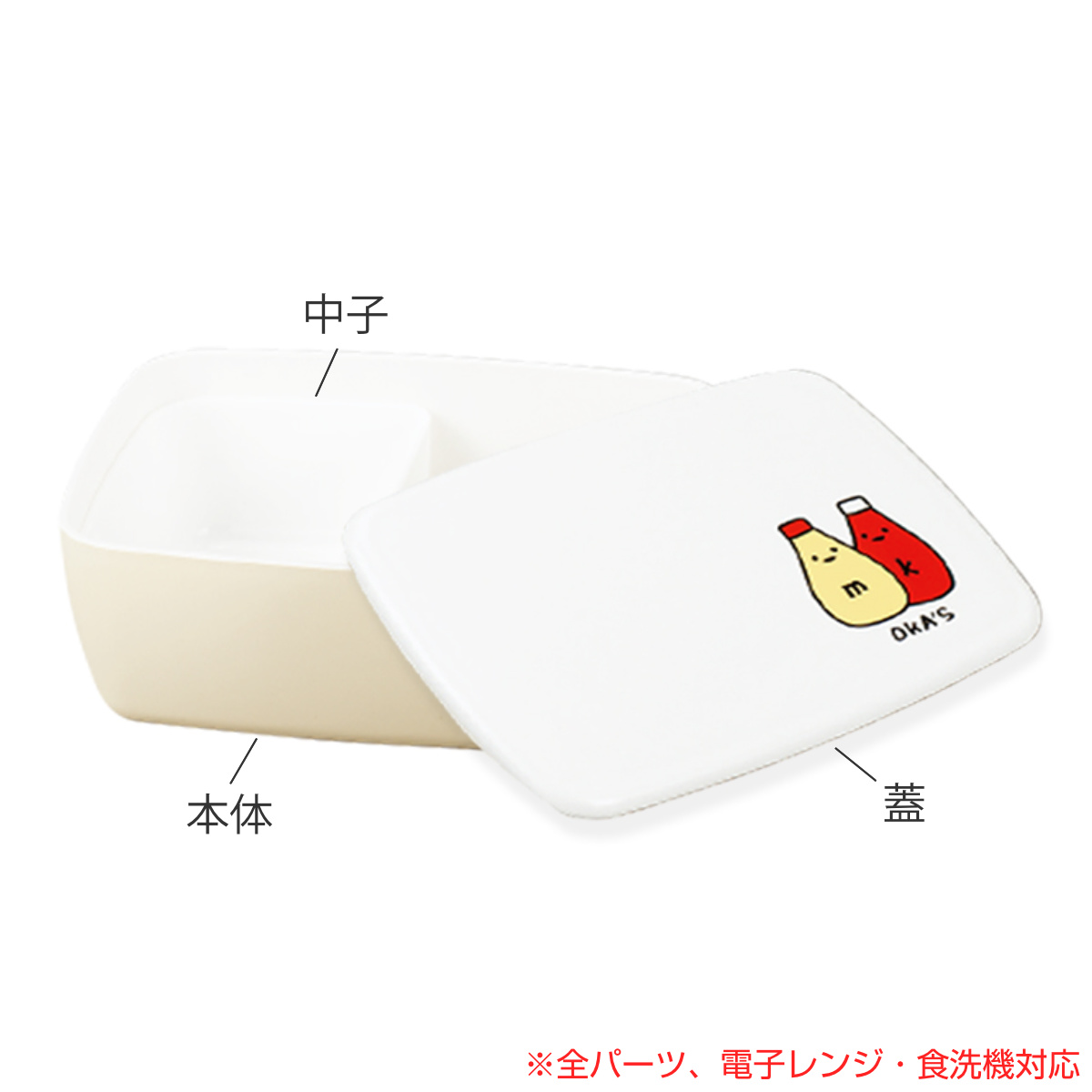●お弁当に合う具材を可愛くデザインした「OKA'S」シリーズの1段弁当箱です。