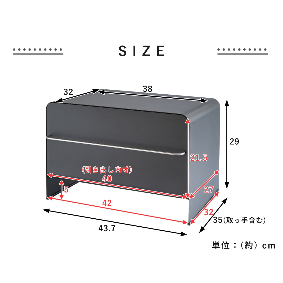 | サイズ | 【外寸】 本体:約 幅43.7×奥行35×高さ29(cm) 天板平面:約 幅38×奥行32(cm) 【内寸】 引き出し:約 幅40×奥行27×高さ21.5(cm) 下部:約 幅42×奥行32×高さ5(cm) |