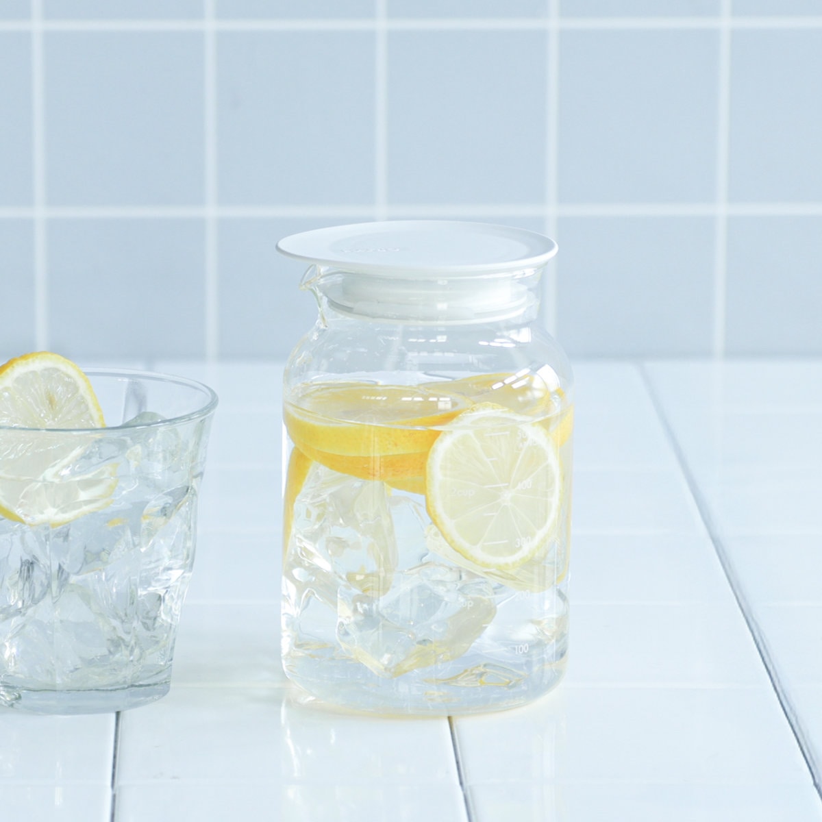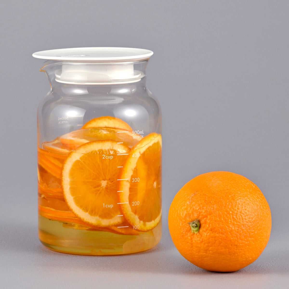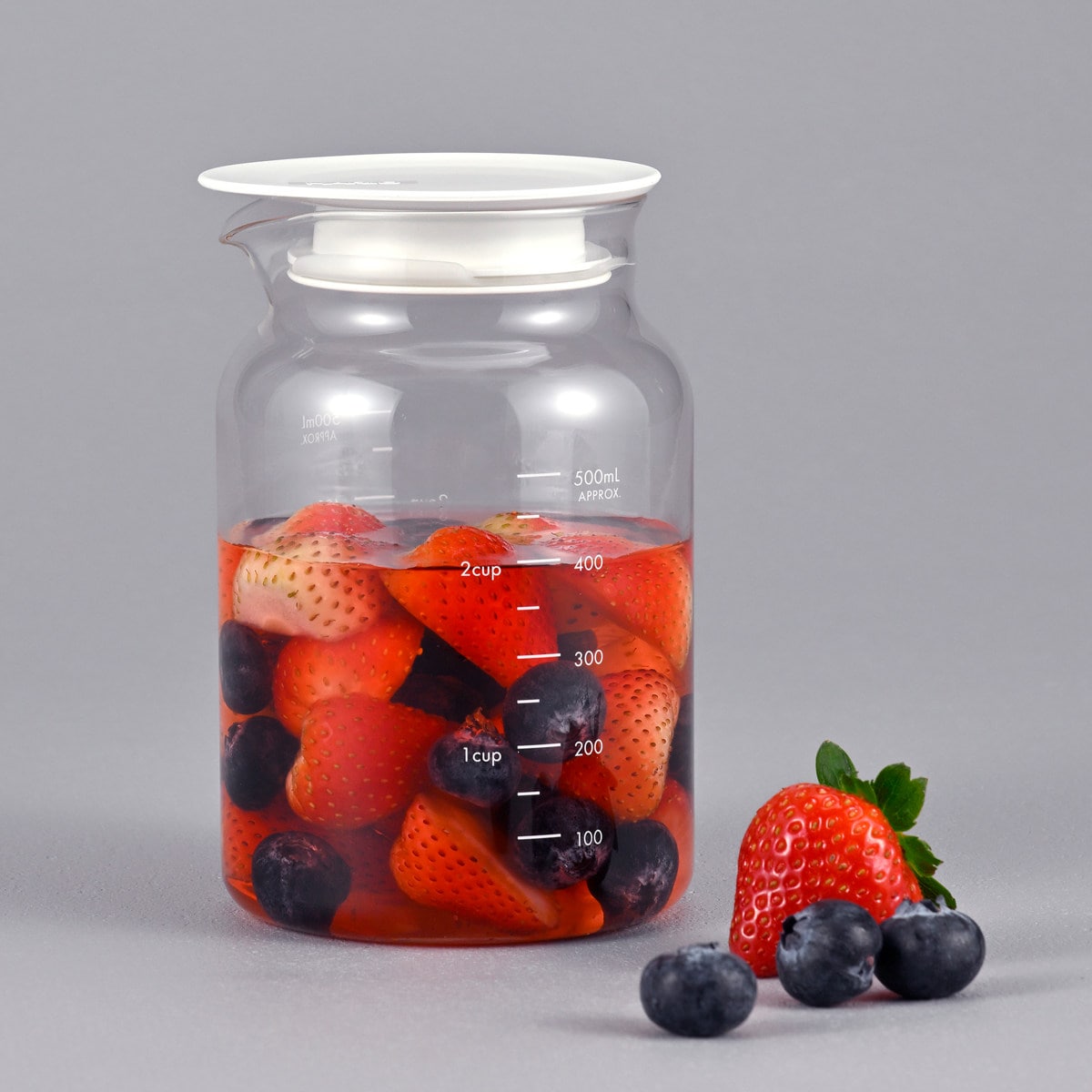 フルーツシロップはもちろん、ビネガードリンク、水出しティー・コーヒーバッグでの抽出、出汁づくりや調味料入れなど幅広く使えるポットです。本体にメモリが付いているので、分量がパッと確認できてとても便利です。