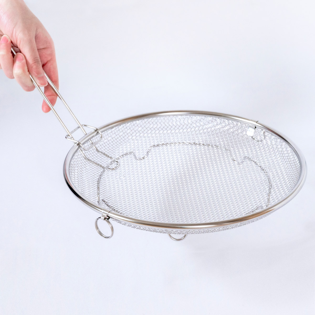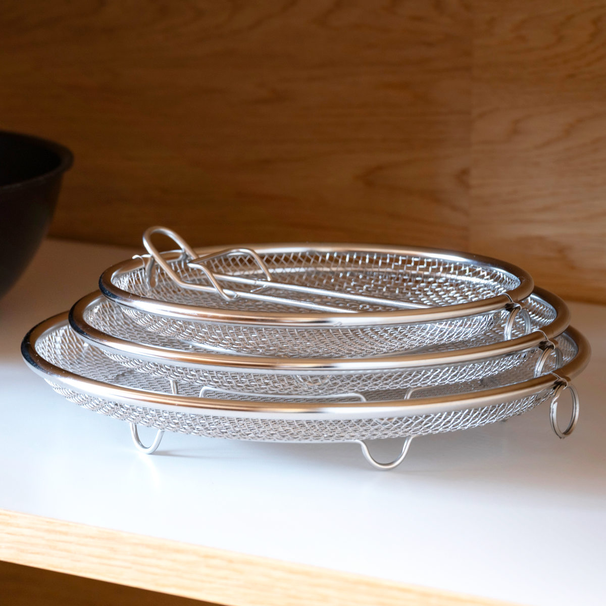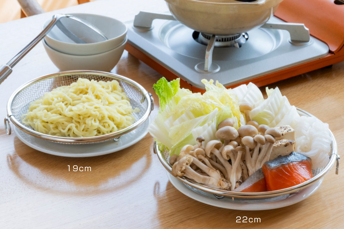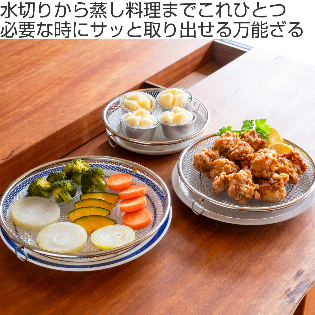 必要な時だけサッと取り出して使える脚付きの盆ざるです。鍋やフライパンにすっきり収まるデザインなので、食器の水切りから麺料理、揚げ物、お鍋の具材、蒸し料理まで幅広くお使いいただけます。