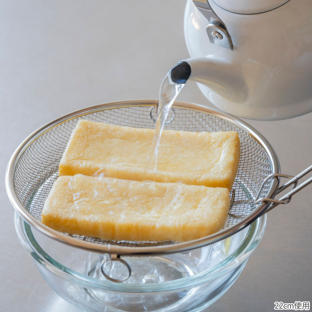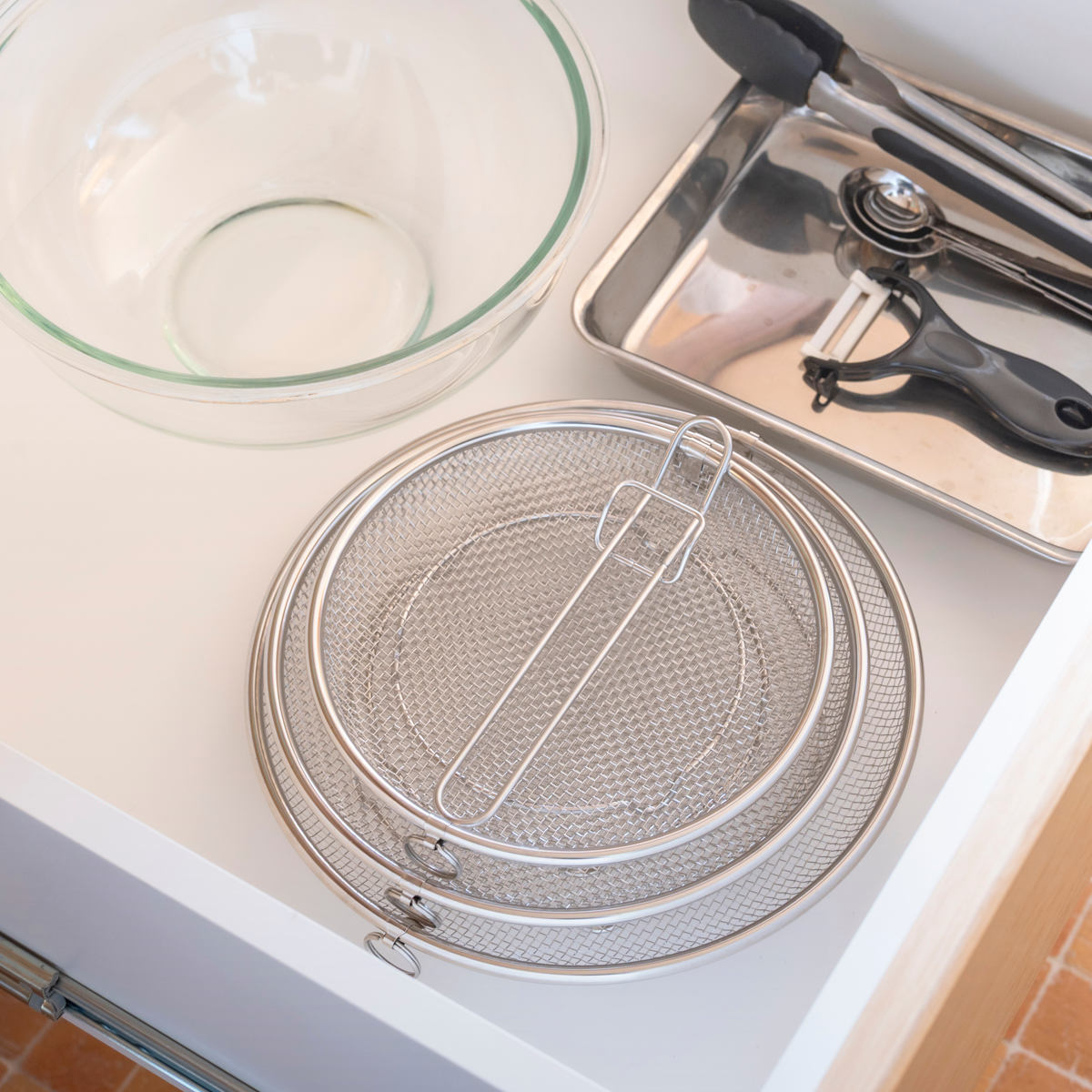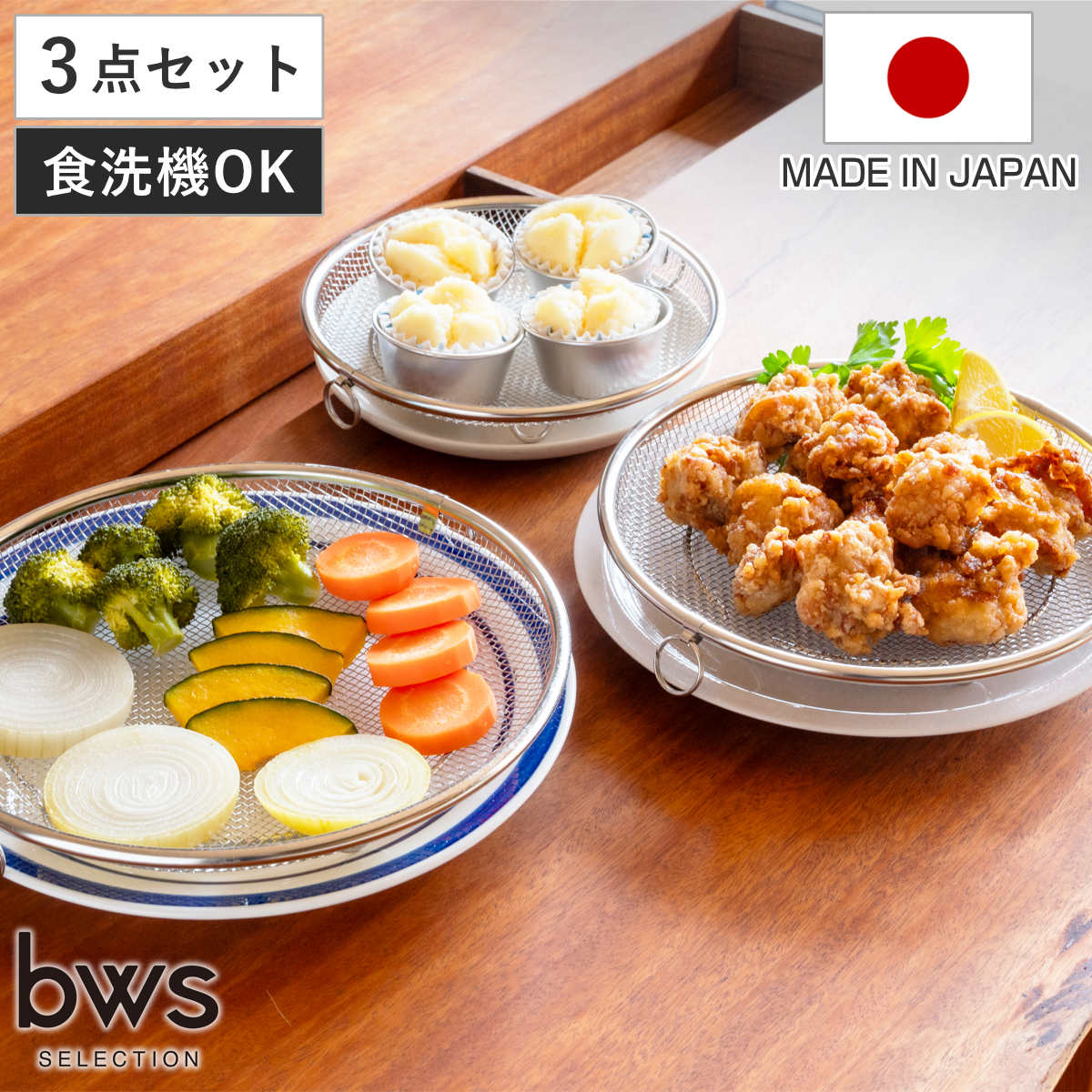 必要な時だけサッと取り出して使える脚付きの盆ざるです。鍋やフライパンにすっきり収まるデザインなので、食器の水切りから麺料理、揚げ物、お鍋の具材、蒸し料理まで幅広くお使いいただけます。