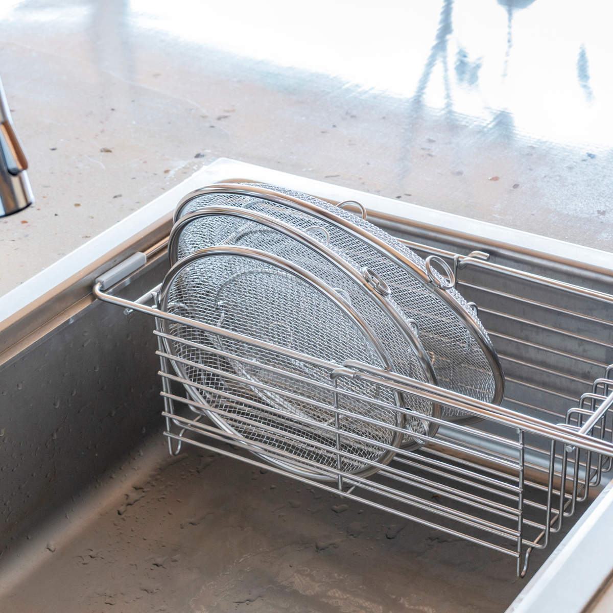両側リングで水切り安定、収納もすっきり