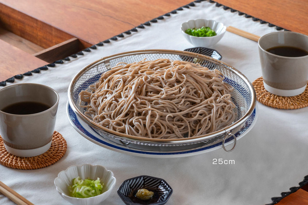 揚げ物や麺料理、鍋料理などさまざまな用途でお使いいただける盆ざるは、取っ手のないシンプルなデザインで調理後そのまま食卓に出しても邪魔になりません。