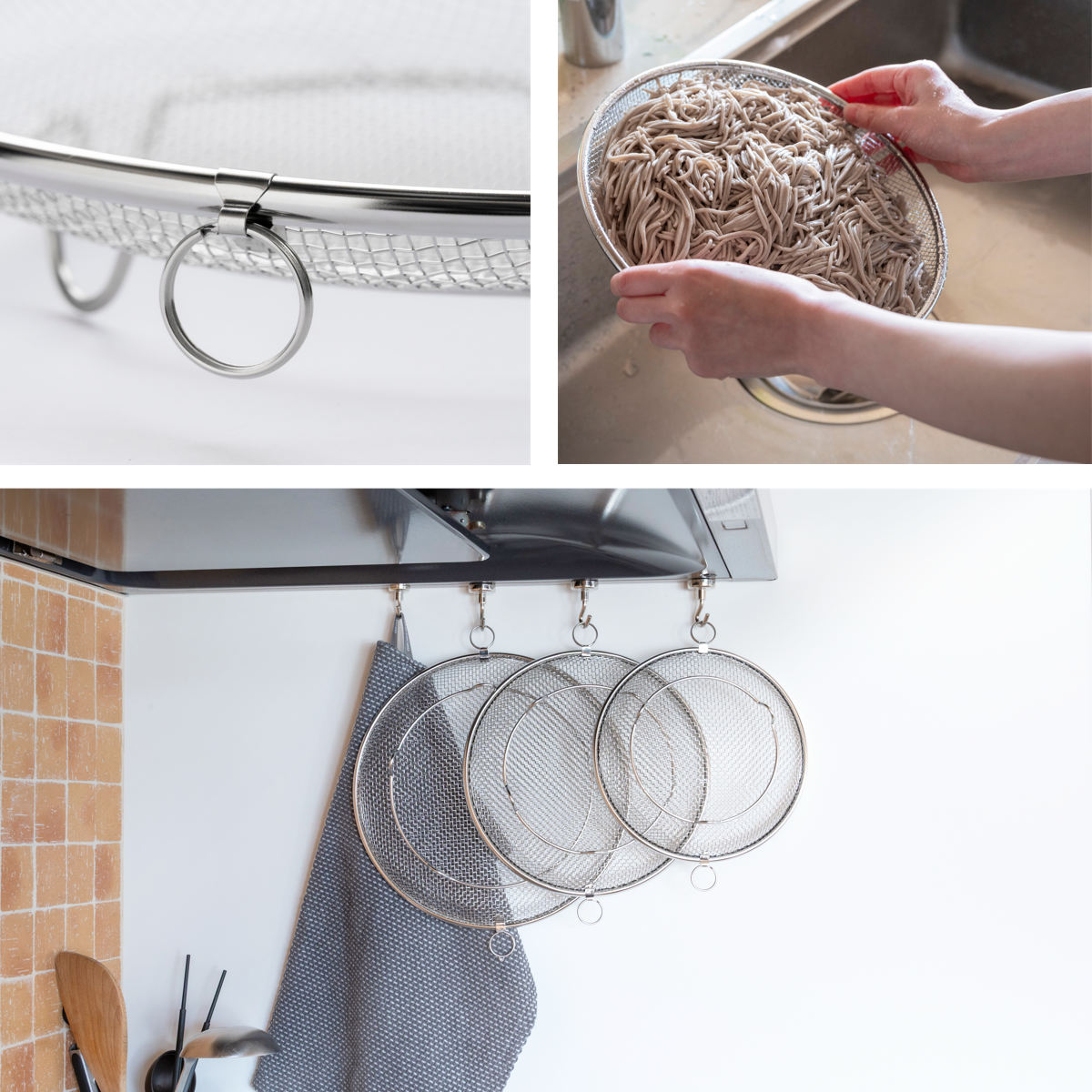 両側にリングが付いているので、水切りの際もしっかり振れて安心。収納時には引っ掛けてすっきり片付けられます。