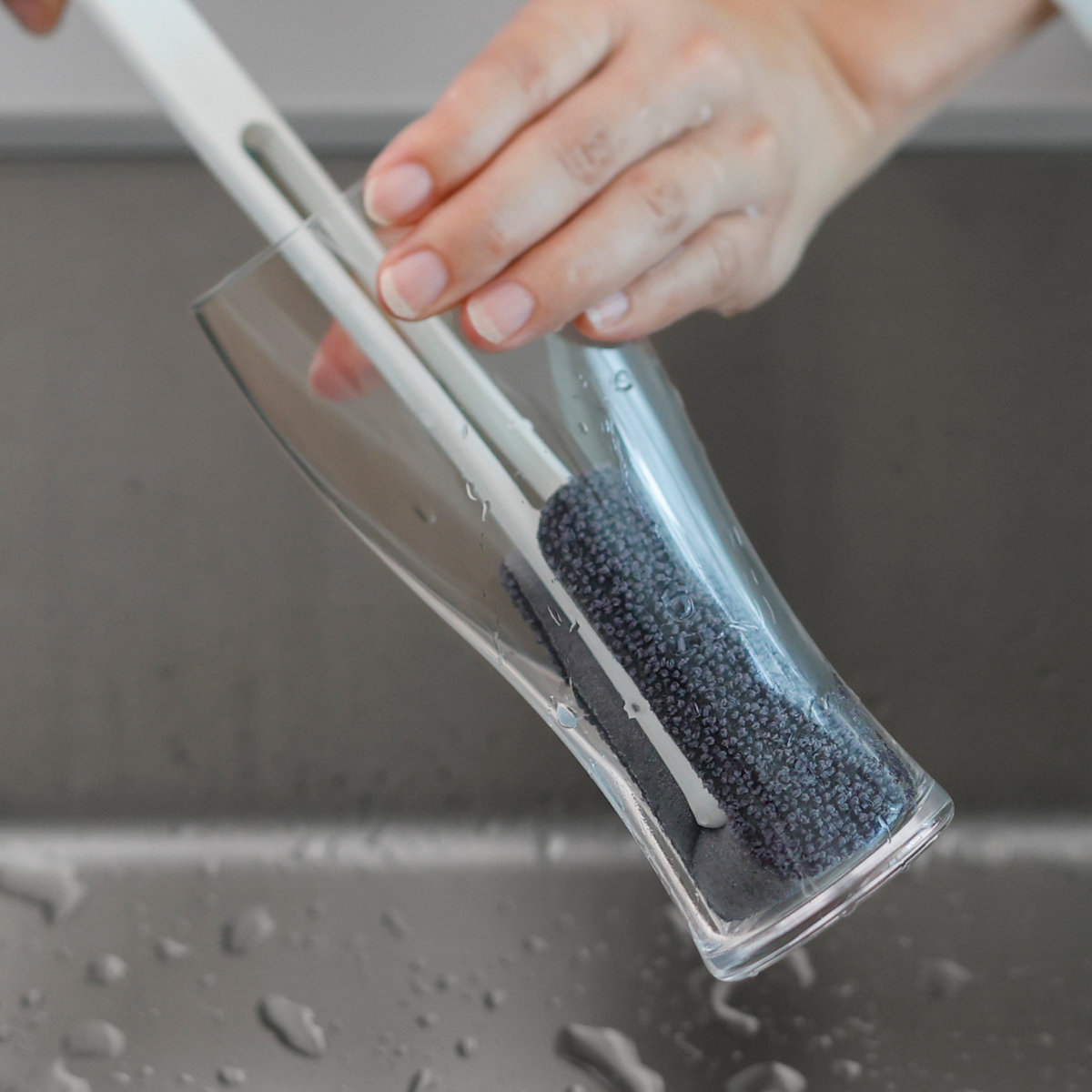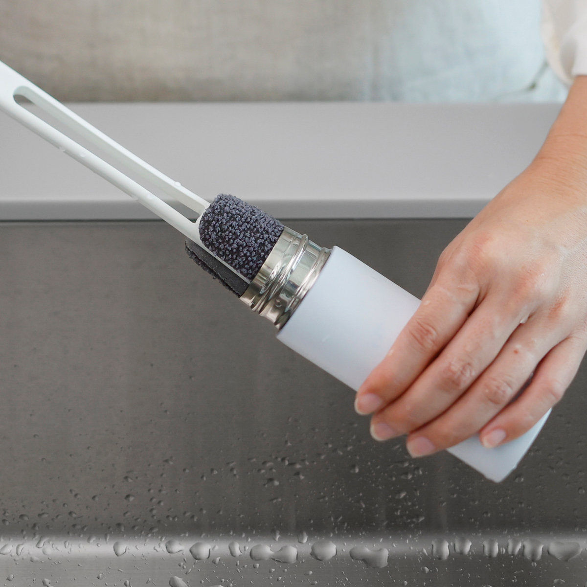 密度のあるウレタンスポンジを、ハード加工パイルで挟み込みました。スポンジにコシがあり、角やフラットな面でボトルの底までしっかり洗えます。ハンドルとスポンジのハード加工面には、抗菌加工が施されています。