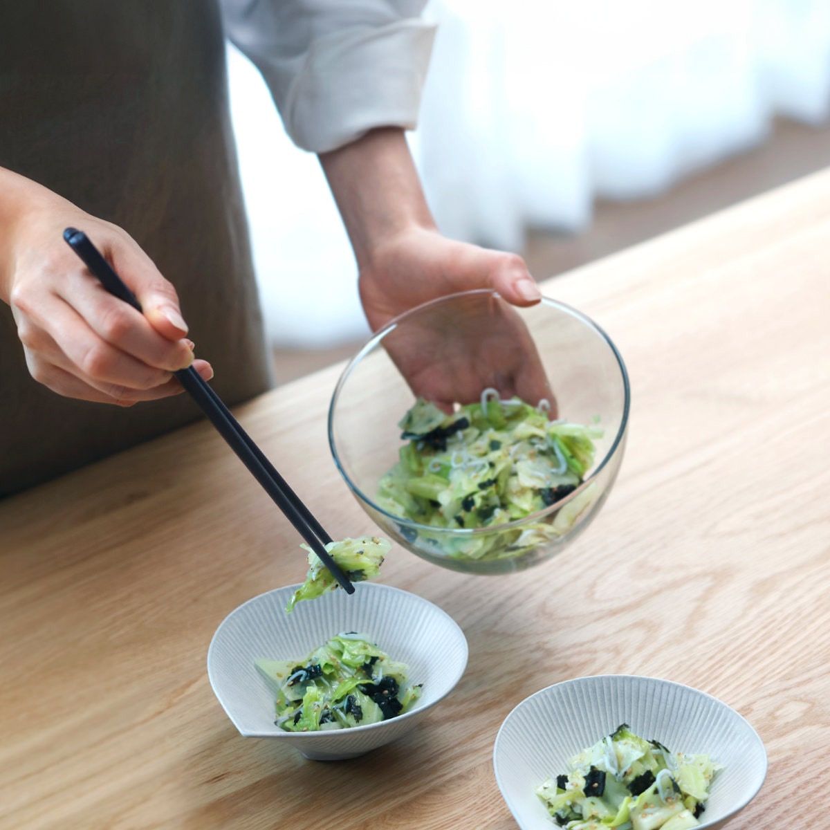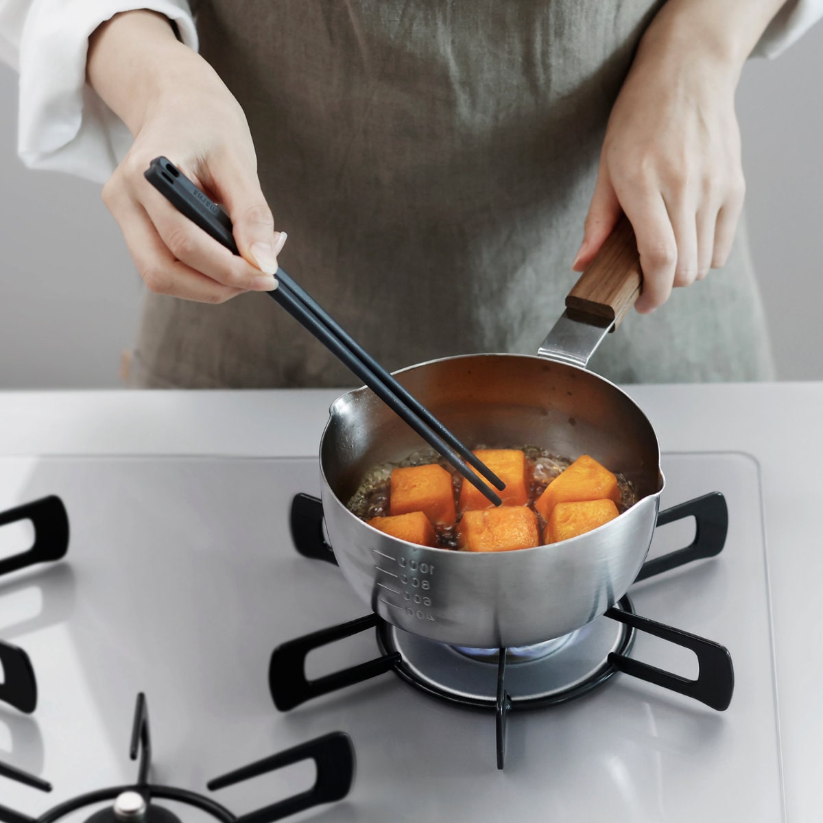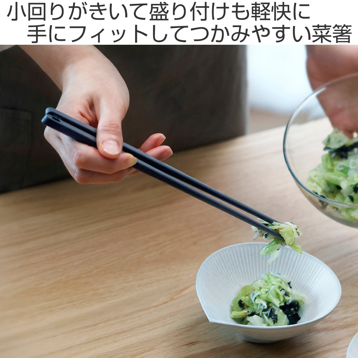 丸みのある四角形から先端に向かって円形へと変化するグラデーション形状を採用。調理台に置いても転がりにくく安定感があり、指にやさしくフィットして細かな動きもスムーズに行えます。また、箸同士が絡みにくい設計です。
