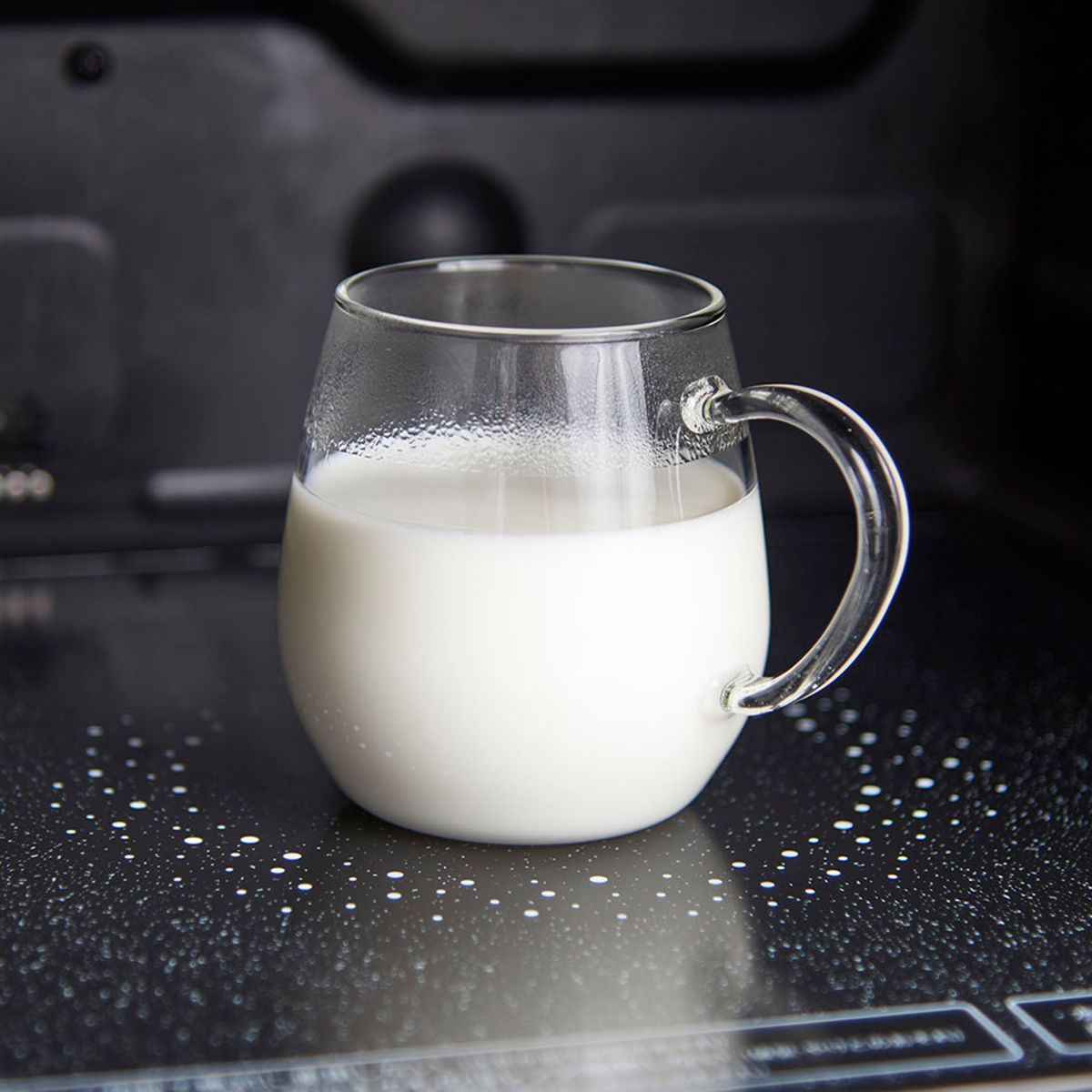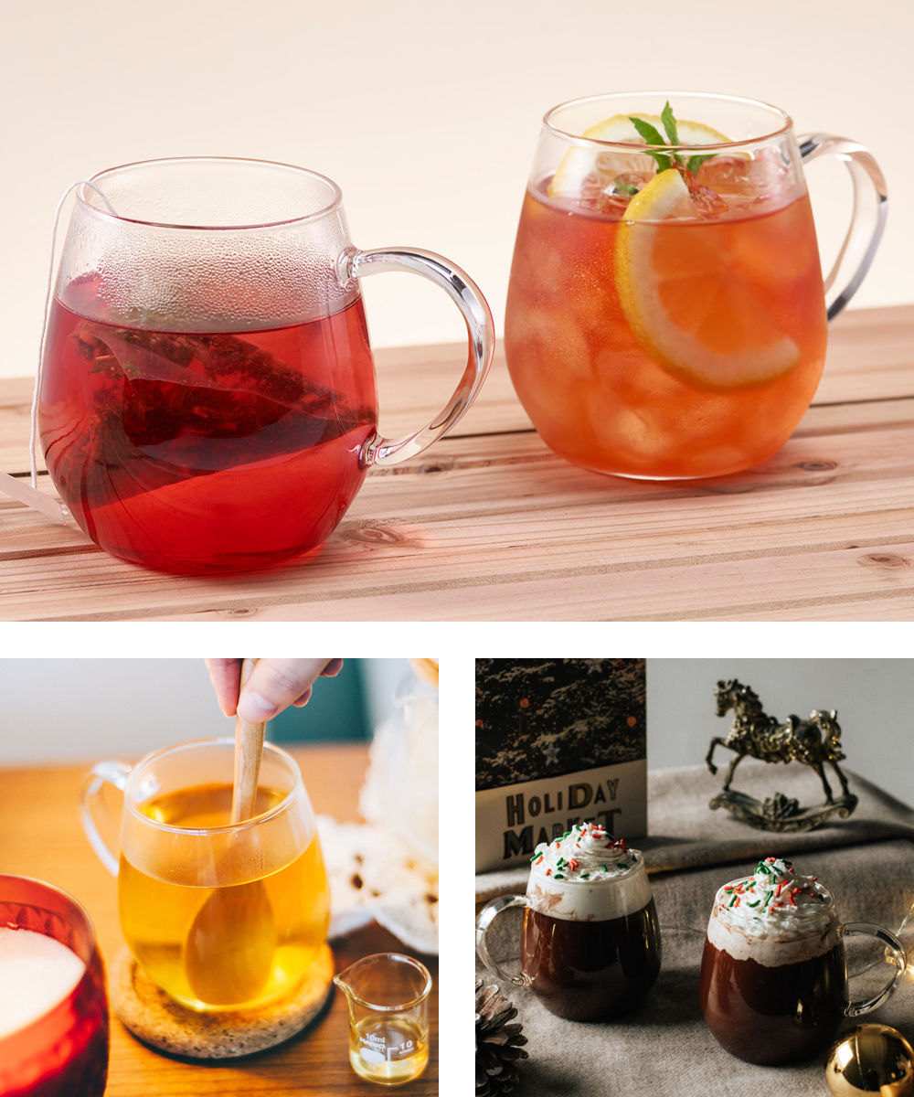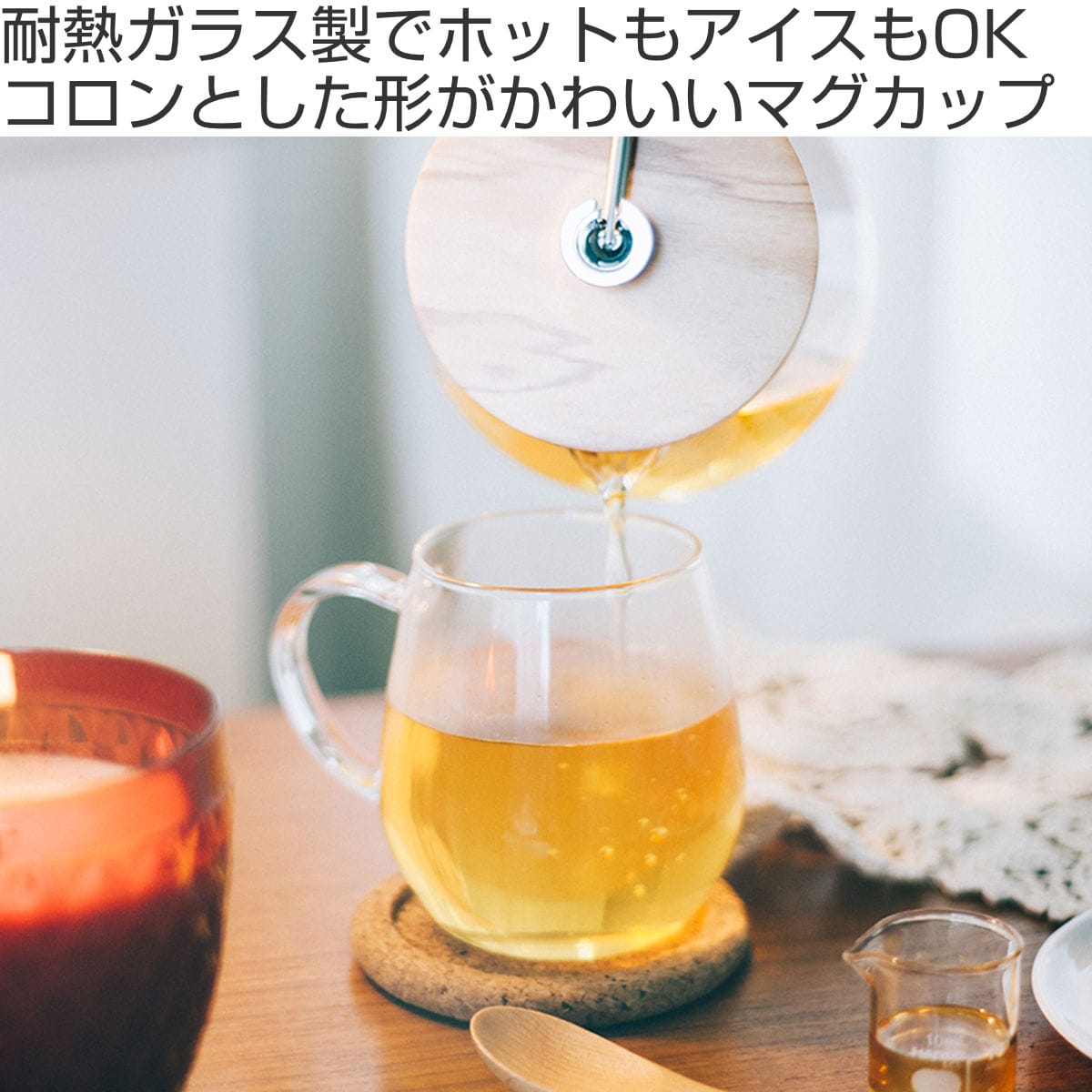 コロンとした形がかわいい耐熱ガラス製のマグカップ