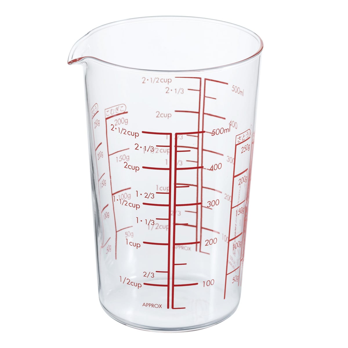 シンプルで使いやすい、耐熱ガラス製のメジャーカップです。透明度の高いガラス素材で目盛りが見やすく、スムーズに計量できます。「さとう」「こむぎこ」専用の目盛り付きで、毎日の下ごしらえもより便利に。500mlまで計量でき、だしやスープもたっぷり計量できます。日常使いはもちろん、作り置きやお菓子作りにも活躍します。