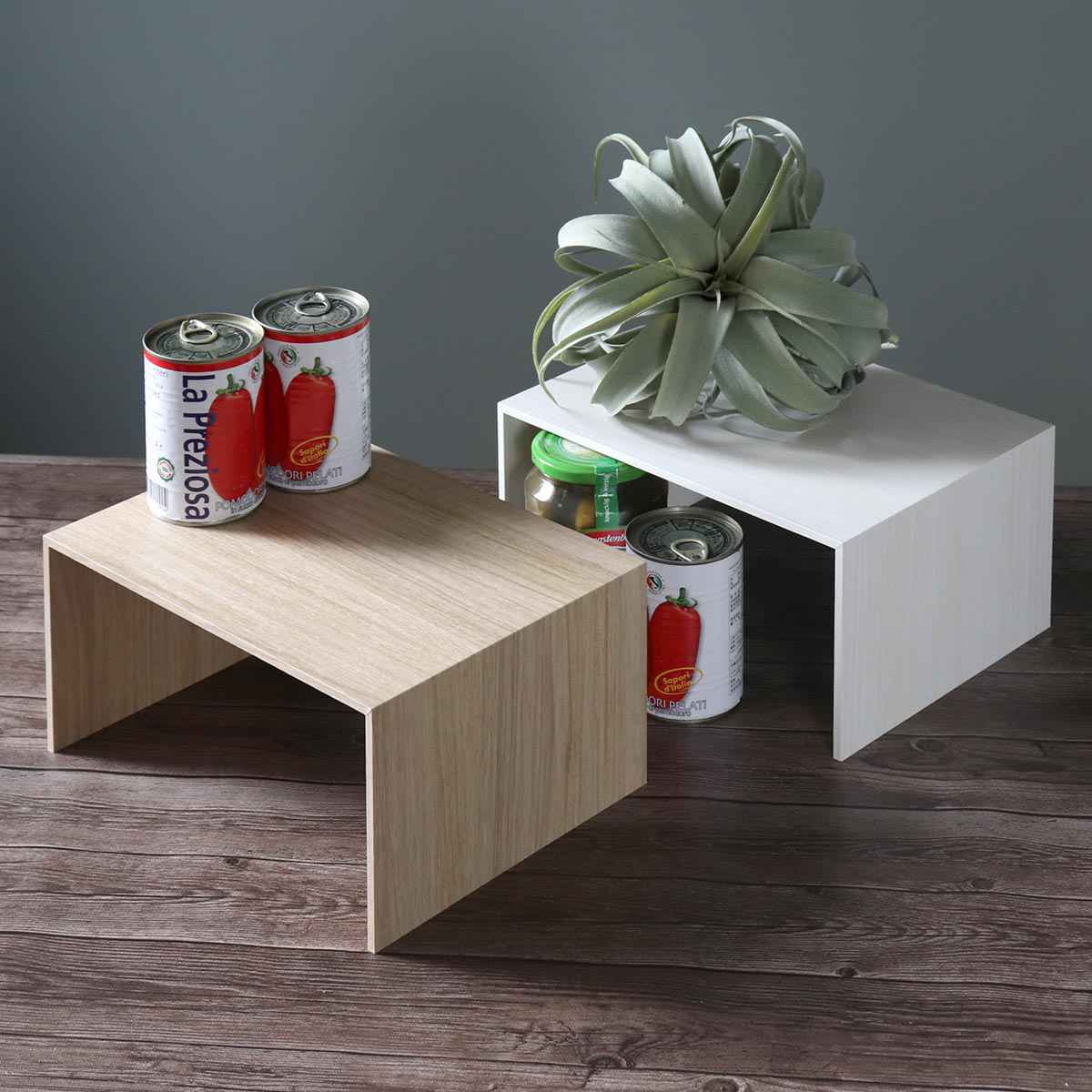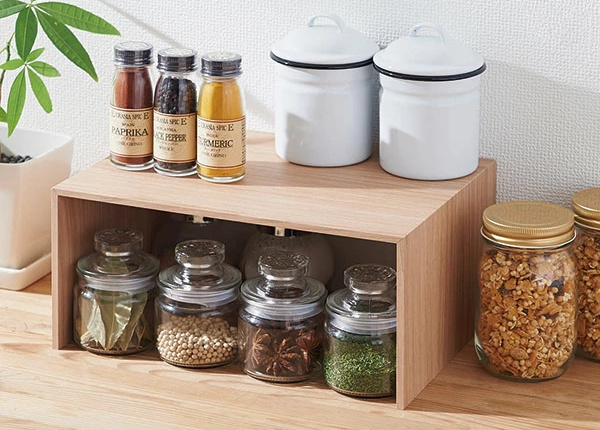 種類が増えがちなスパイスや調味料の見せる収納としても。よく使うものを上段や手前に置けば、取り出しもスムーズ。また、トレーと組み合わせて使うことで、キッチンだけでなくお部屋の様々な場所でお使いいただけます。