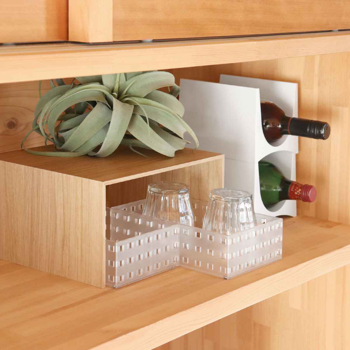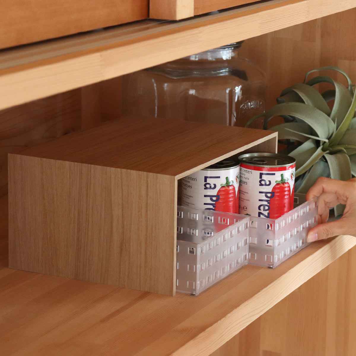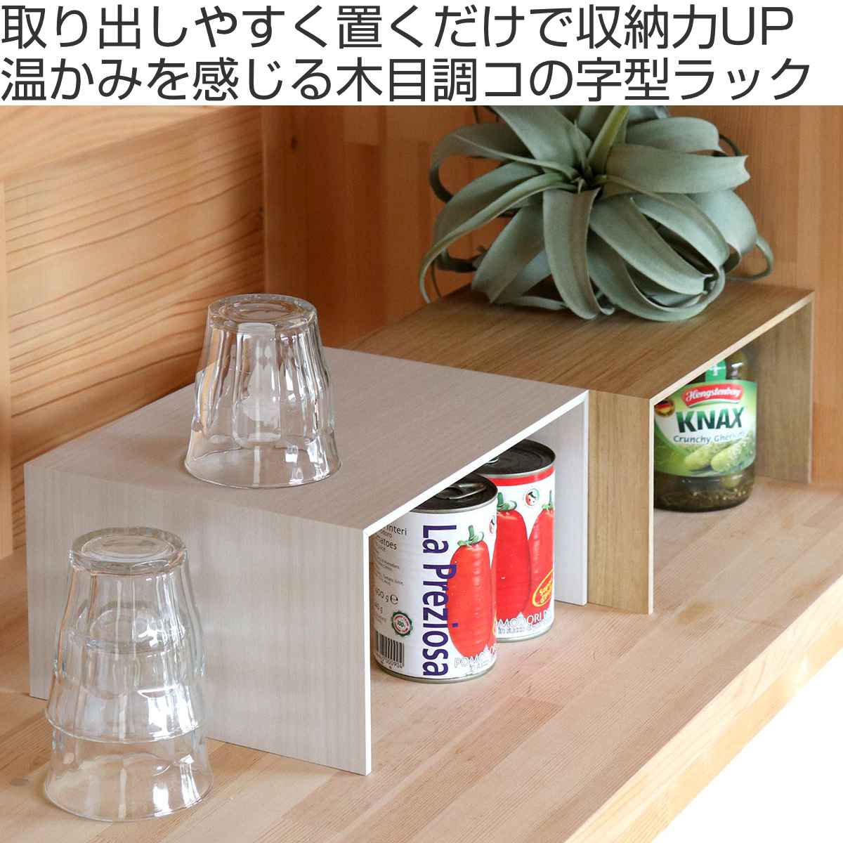 収納スペースを増やしたい場所に置くだけで、手軽に収納力をプラスできるプラスラックです。棚板を1枚増やすような感覚で、簡単に設置可能。食器棚やカップボードなど、「あと少し」収納スペースが欲しいときにおすすめです。