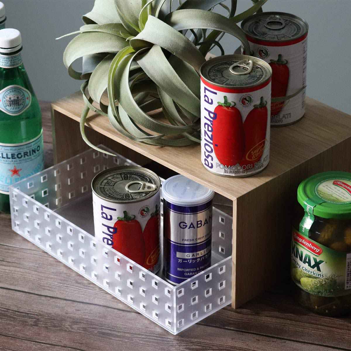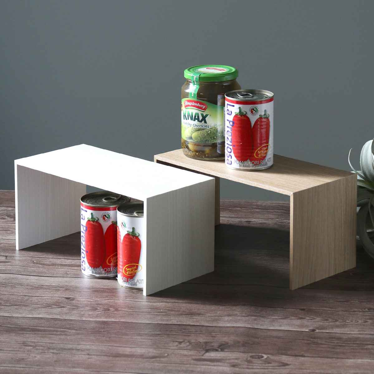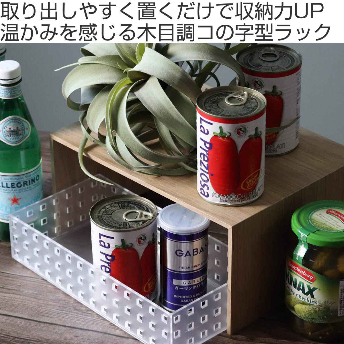 種類が増えがちなスパイスや調味料の見せる収納としても。よく使うものを上段や手前に置けば、取り出しもスムーズ。また、トレーと組み合わせて使うことで、キッチンだけでなくお部屋の様々な場所でお使いいただけます。