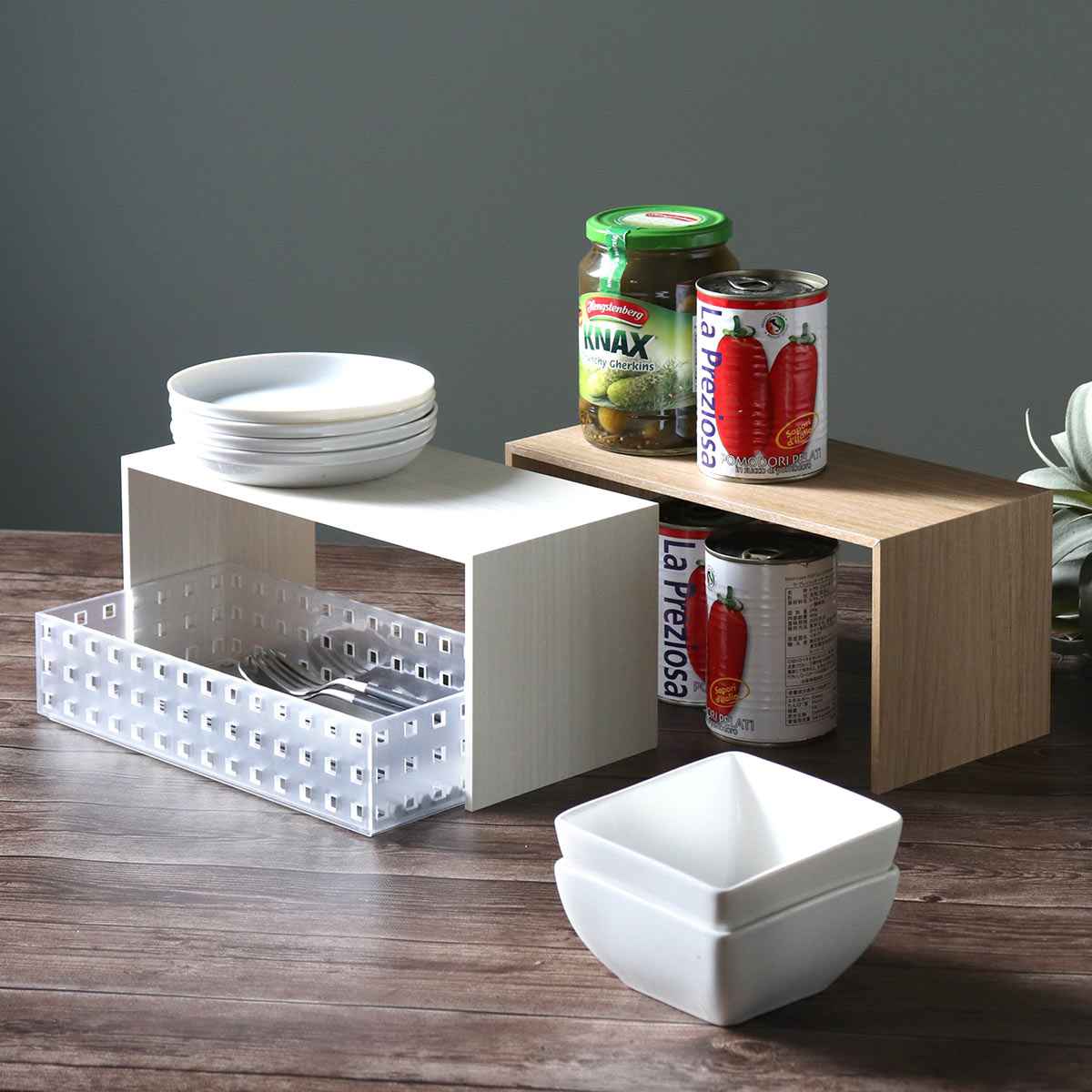 収納スペースを増やしたい場所に置くだけで、手軽に収納力をプラスできるプラスラックです。棚板を1枚増やすような感覚で、簡単に設置可能。食器棚やカップボードなど、「あと少し」収納スペースが欲しいときにおすすめです。