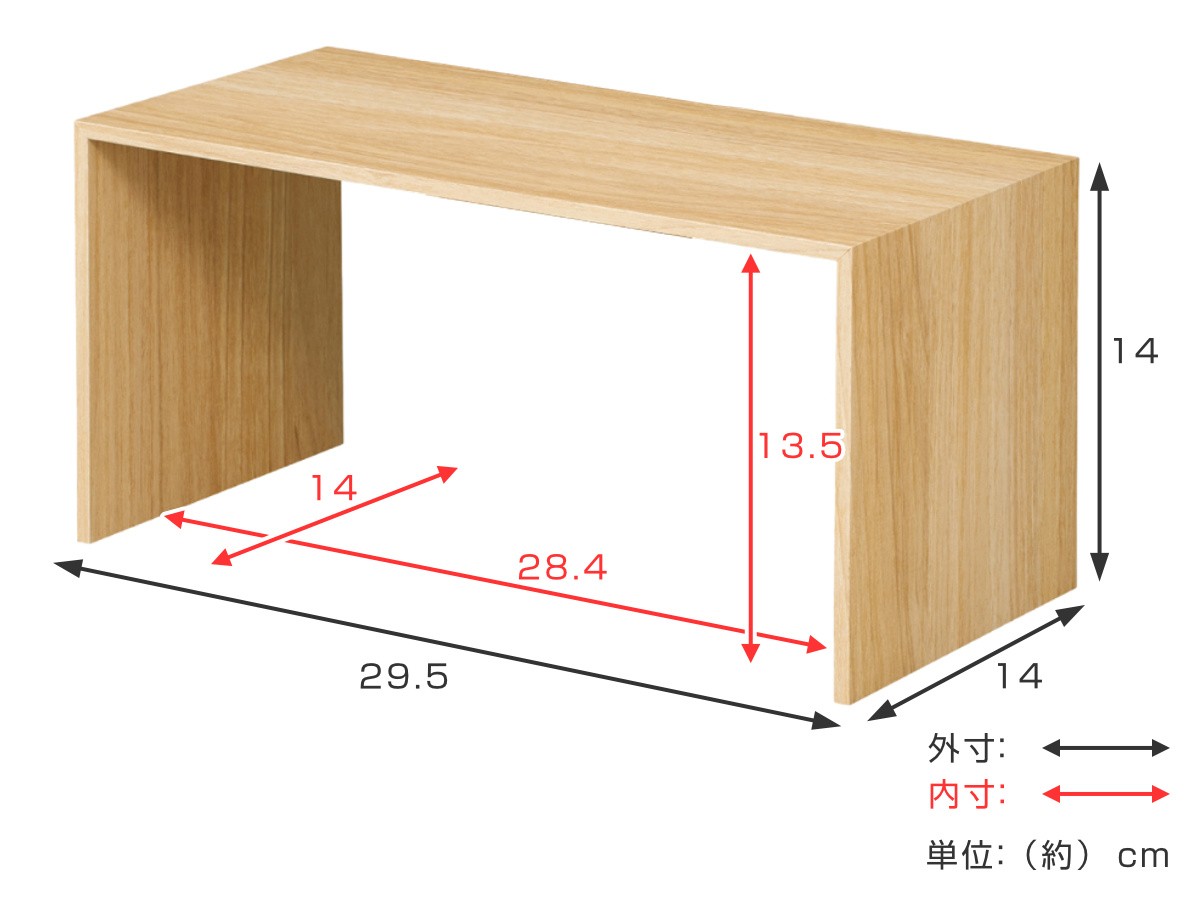 | サイズ | 外寸:約 幅29.5×奥行14×高さ14(cm) 内寸:約 幅28.4×奥行14×高さ13.5(cm) |