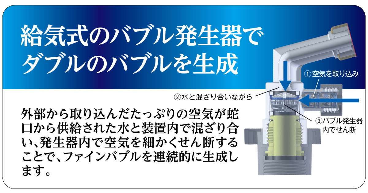 ウルトラファインバブル(直径1マイクロメートル未満の泡)は、繊維のすき間よりも小さいため、洗剤を抱え込んですき間に入り込み繊維の奥に潜んだ汚れにアプローチします。マイクロバブル(直径100マイクロメートル未満1マイクロメートル以上の泡)は、表面に付着した頑固な汚れを強力に引きはがします。