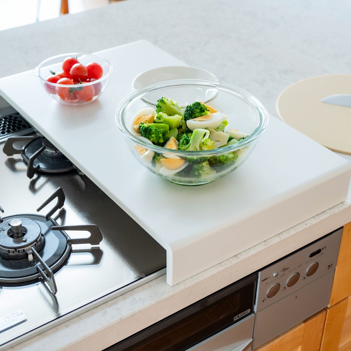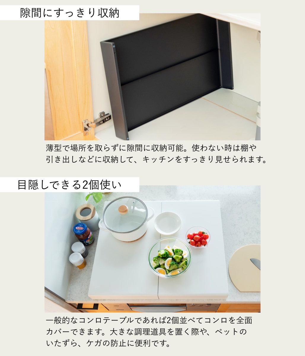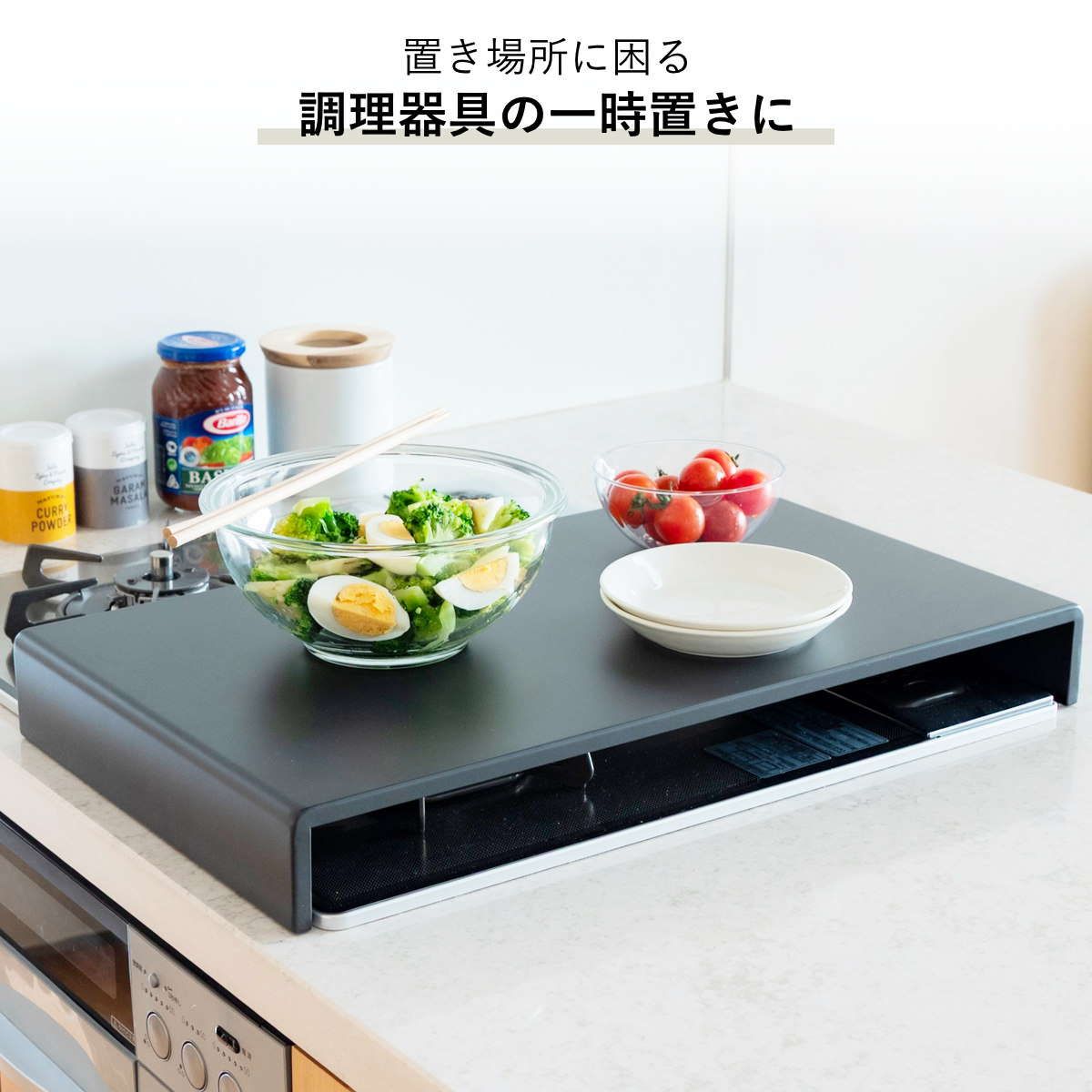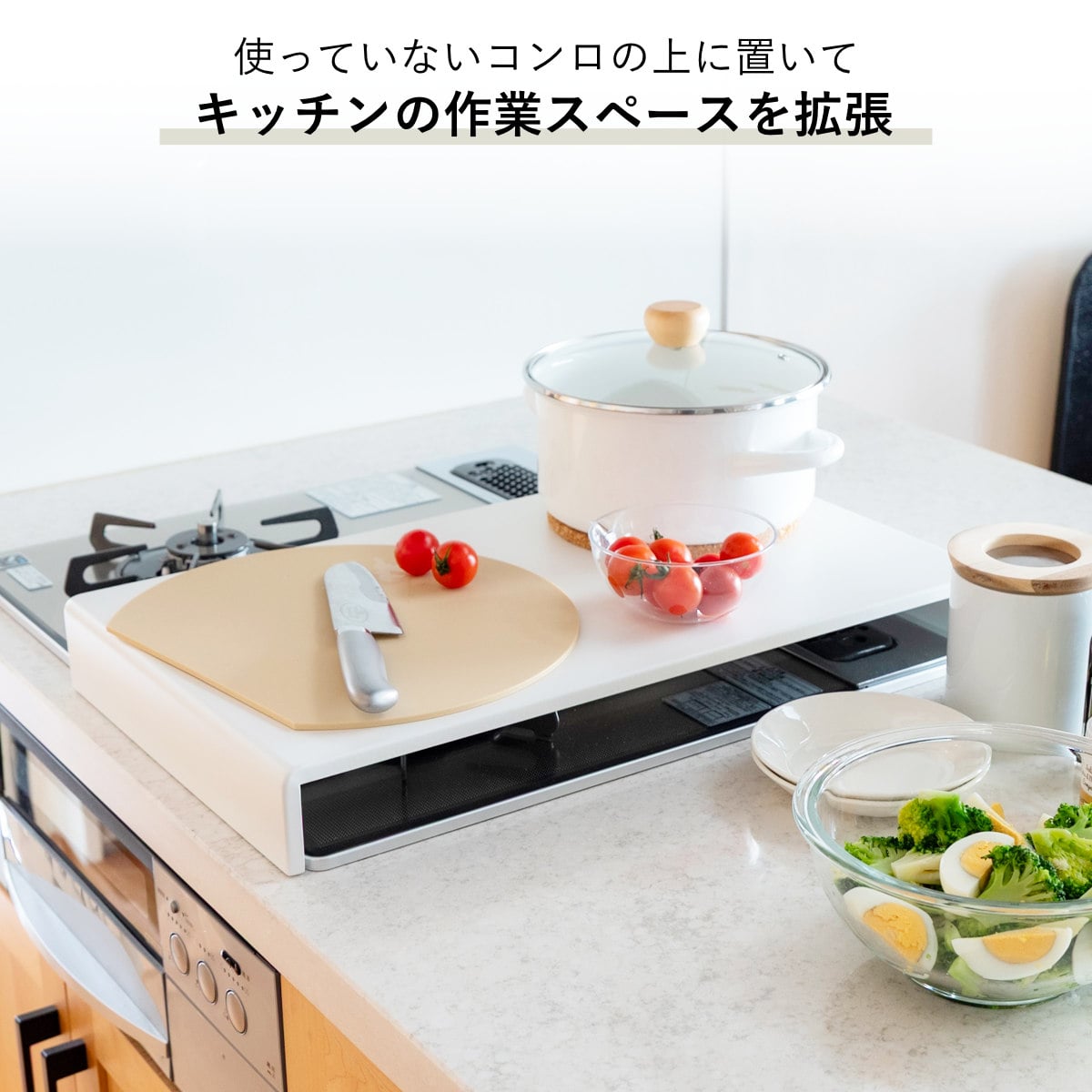 使っていないコンロの上に置くだけで、下ごしらえや盛り付けなどの簡易作業台として活用できるコンロカバーです。まな板を置いてのカット作業など、限られたキッチンスペースを有効活用できます。