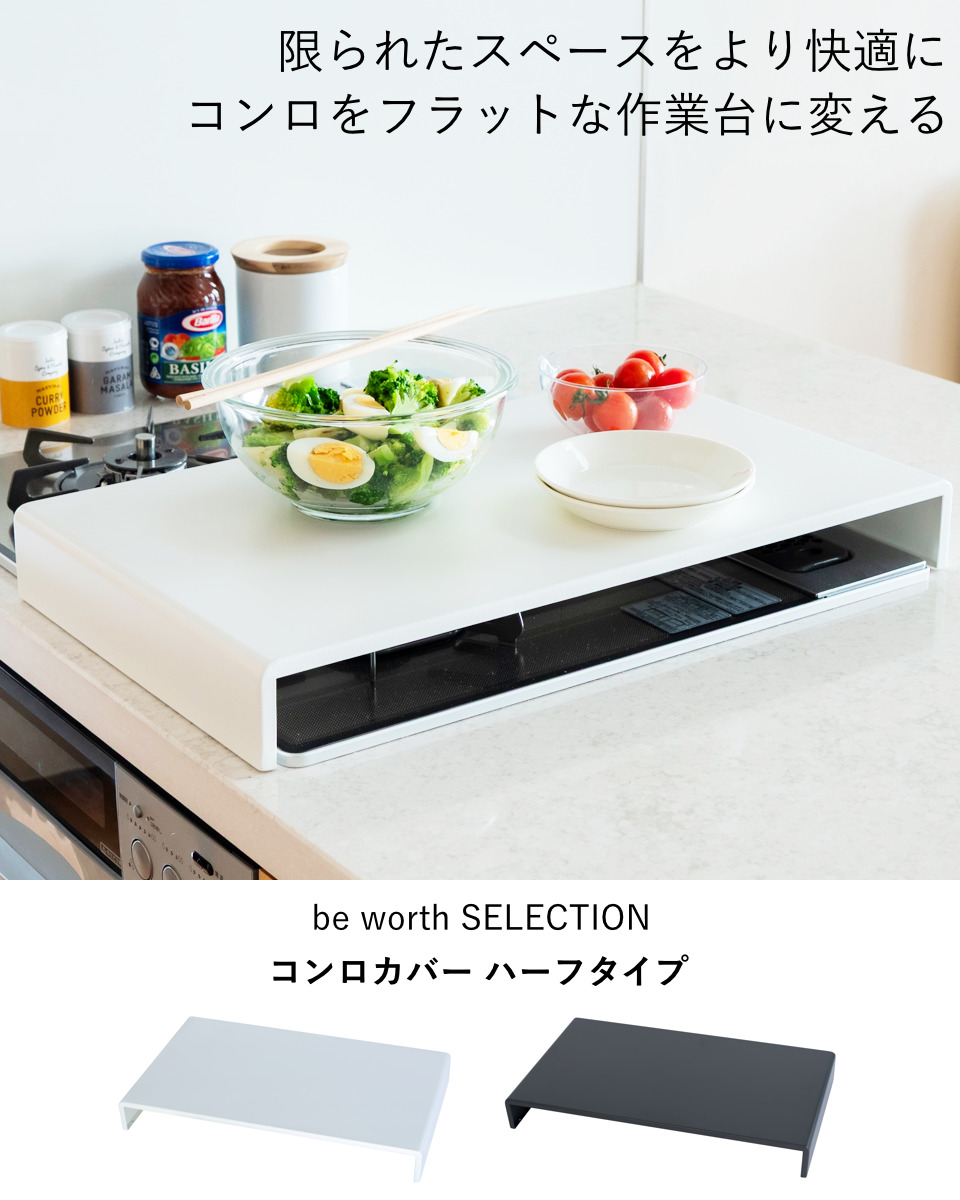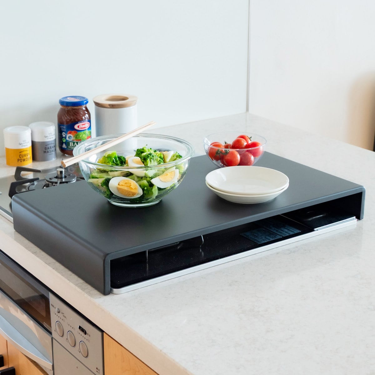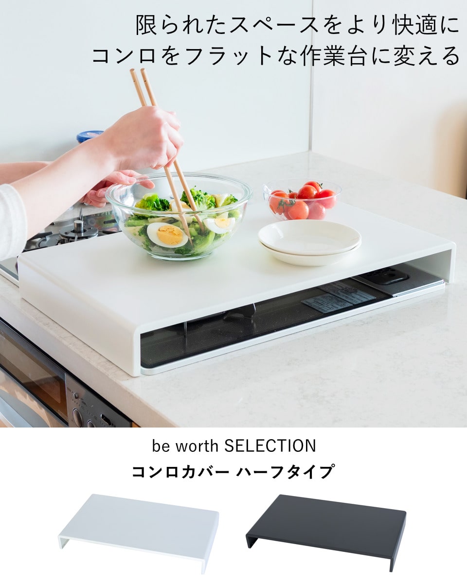 使っていないコンロの上に置くだけで、下ごしらえや盛り付けなどの簡易作業台として活用できるコンロカバーです。まな板を置いてのカット作業など、限られたキッチンスペースを有効活用できます。