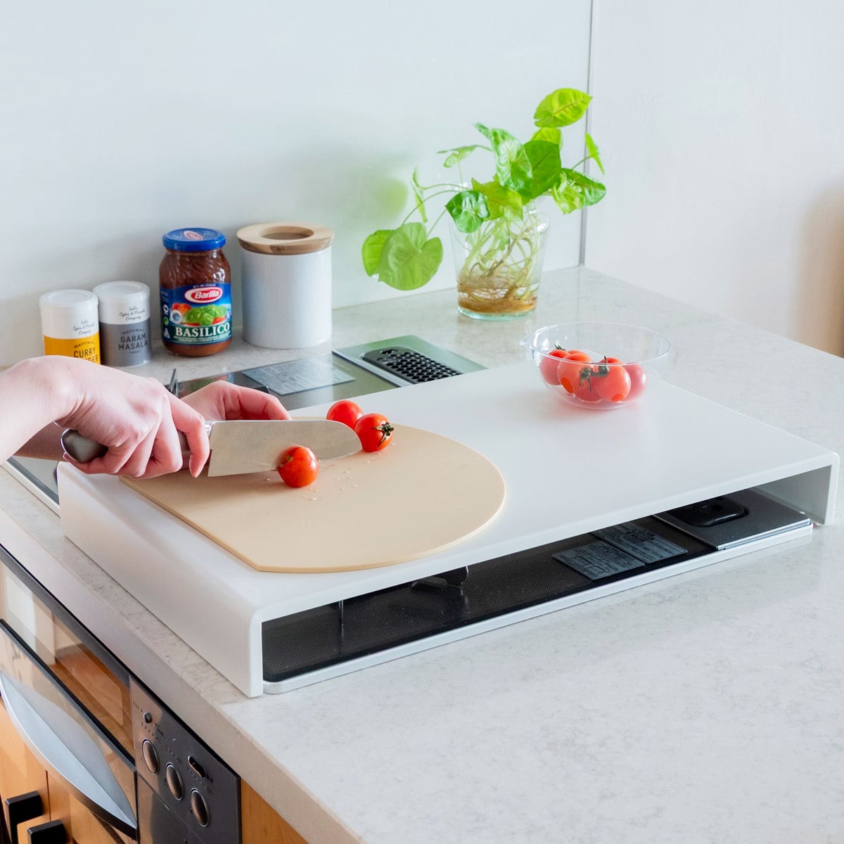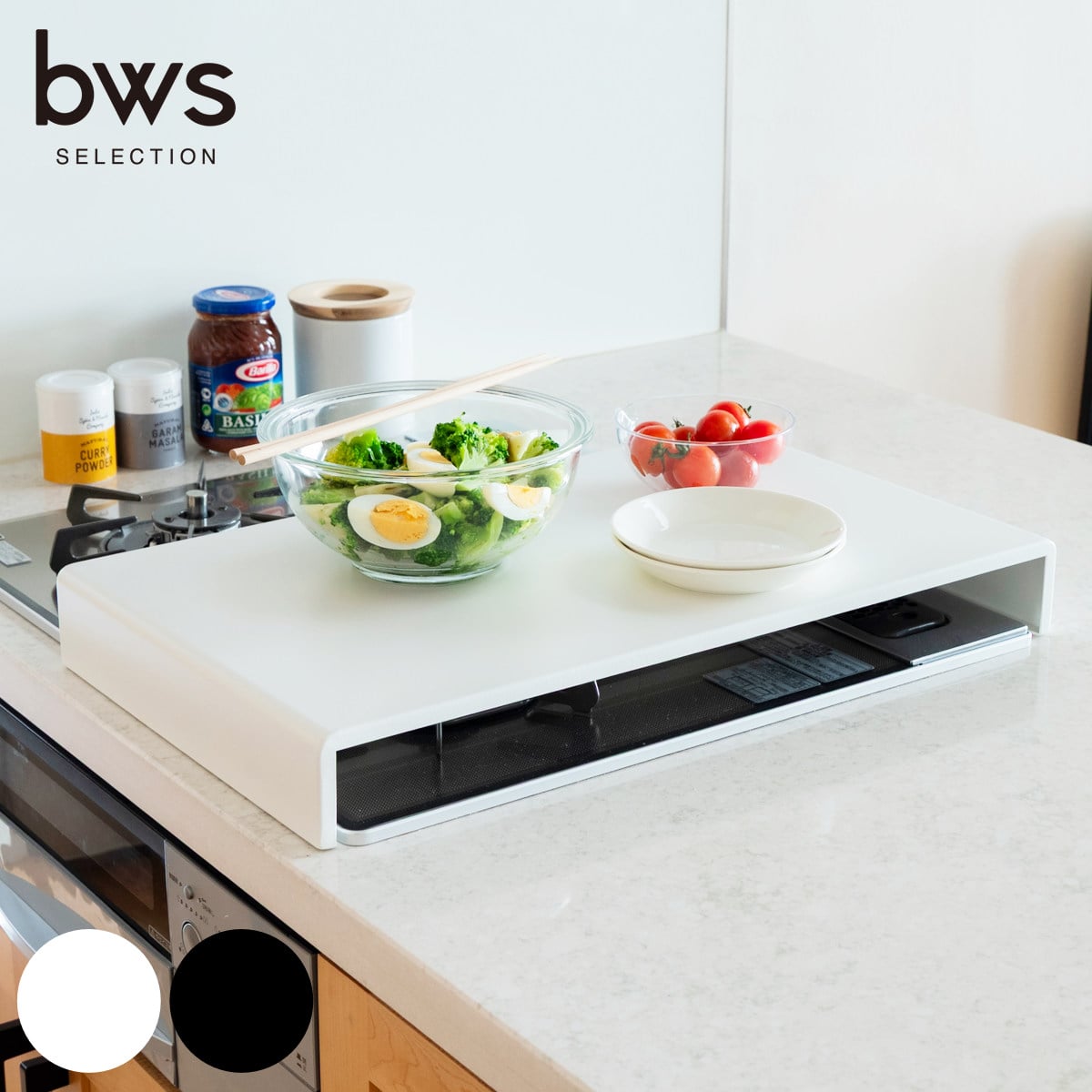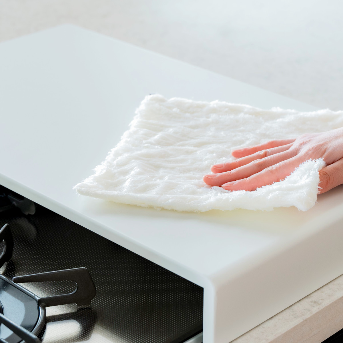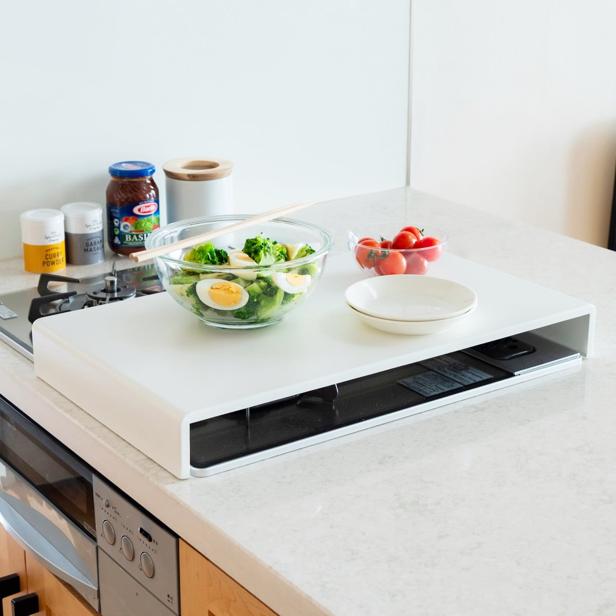 使っていないコンロの上に置くだけで、下ごしらえや盛り付けなどの簡易作業台として活用できるコンロカバーです。まな板を置いてのカット作業など、限られたキッチンスペースを有効活用できます。